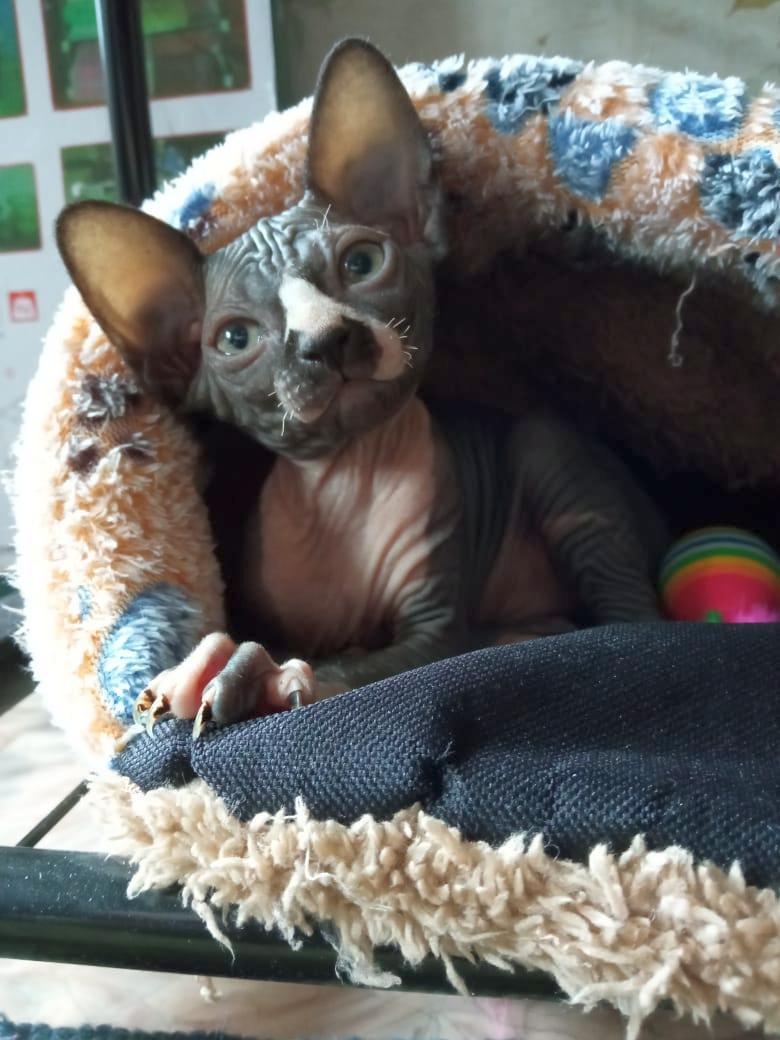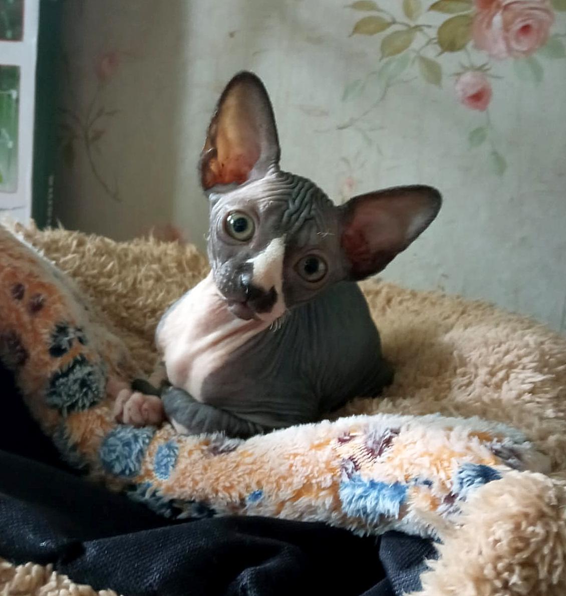 Но, так получилось, что мне достался котёнок. Девочка, канадский сфинкс. Говорят, возрастом два месяца. Кормили её дома жёваной колбасой и молоком из пакета.