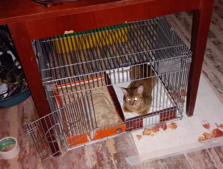 Вечером я принесла металлическую клетку для кошек (такие используют на выставках) для очного знакомства. С четырёх сторон клетку прикрыла, чтобы открытой была только одна сторона. В клетку определила лежанку, лоток, позже и миски. Первой осваивать квартиру отправили кошку, чтоб котёнок поиграл перед сном и побегал под присмотром по квартире. Конечно, сначала были ор и шипение, попытки ударить лапой. Котёнок быстро понял, что рядом лучше не бегать и дело пошло на лад. Было интересно наблюдать за поведением кошки. С одной стороны агрессия к незнакомцу, с другой любопытство и желание поиграть с ним. Перед сном я покормила кошку в клетке вкусненьким (куриный фарш) и поменяла животных местами. Кошку на волю, котёнка на ночь в клетку. Кошка походила вокруг, демонстративно пошипела, но было хорошо заметно, что она стала намного мягче и спокойнее. Ночь прошла спокойно.