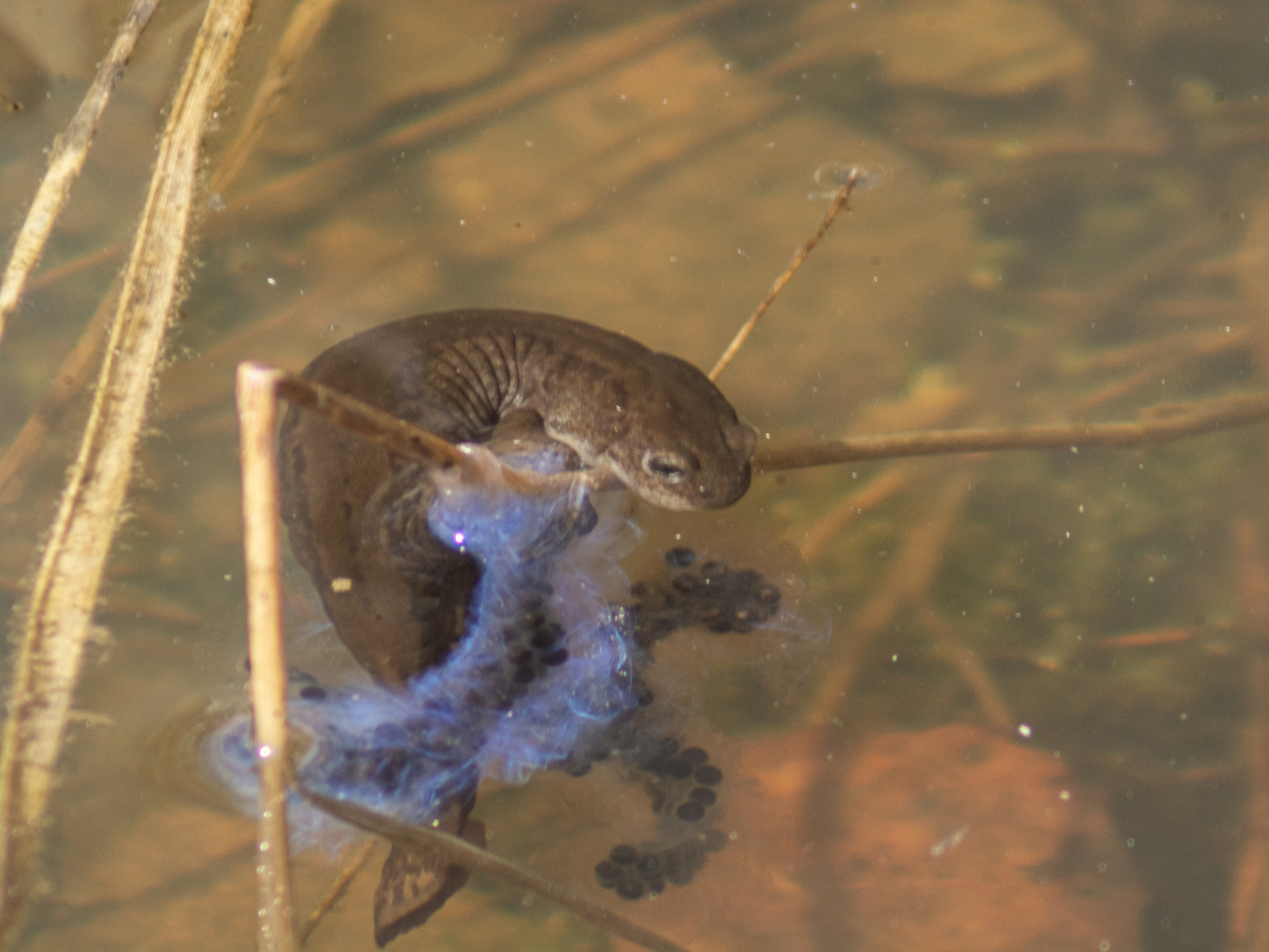 Плавая вокруг икринок, самка как бы охраняет её, от других углозубов и даже вступает в бой с непрошеными гостями. Самка атакует других углозубов в лоб, в прямом смысле и затем помогает лапками, потом начинает закручиваться создавая вибрации, я так понимаю они общаются вибрациями и движениями своего тела.