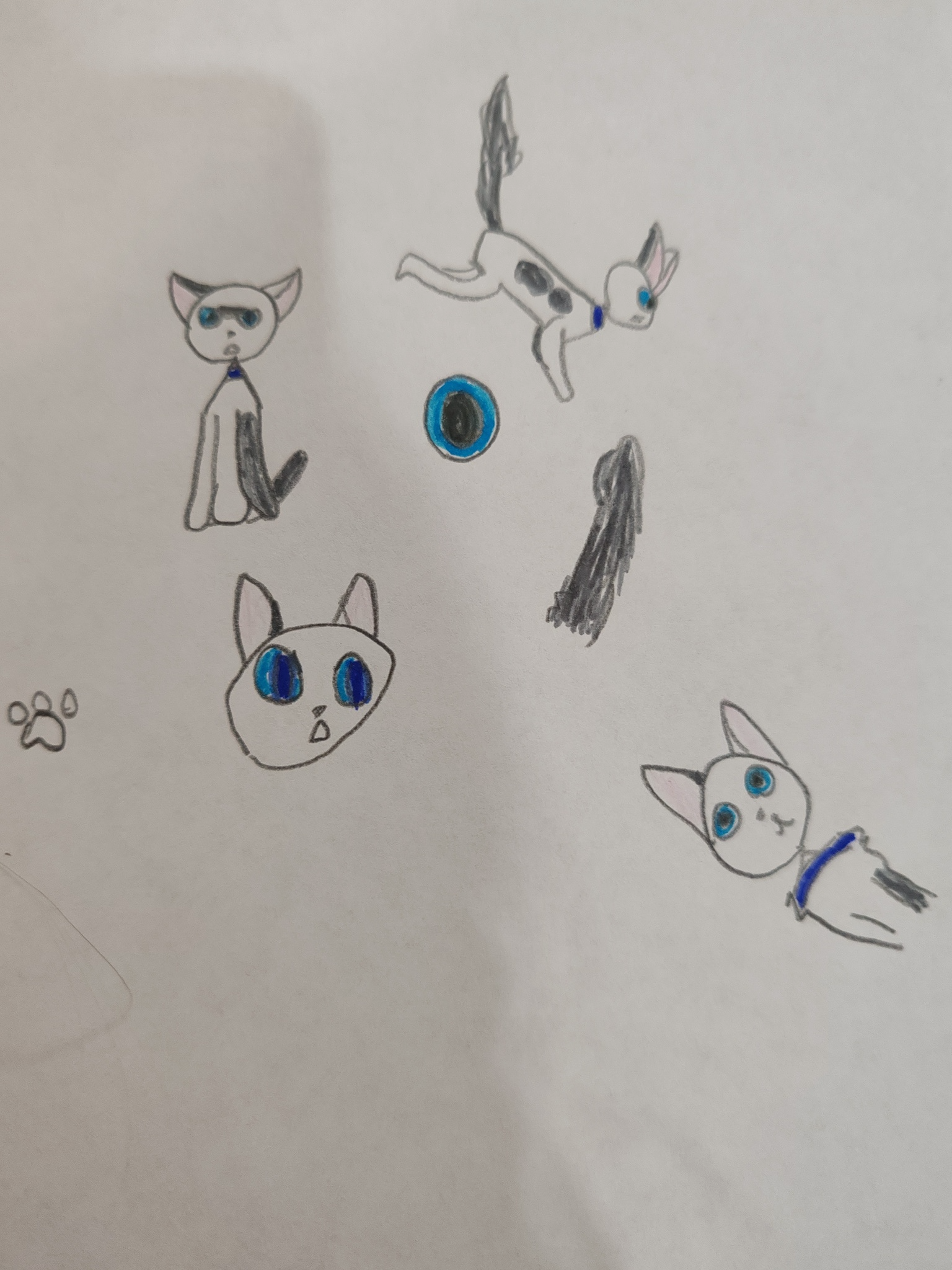 Знакомьтесь, новый персонаж под названием кошка! Она пушистая, шерсть белая с серыми пятнами. Глаза серо-голубые. Её хозяйку зовут Валя.