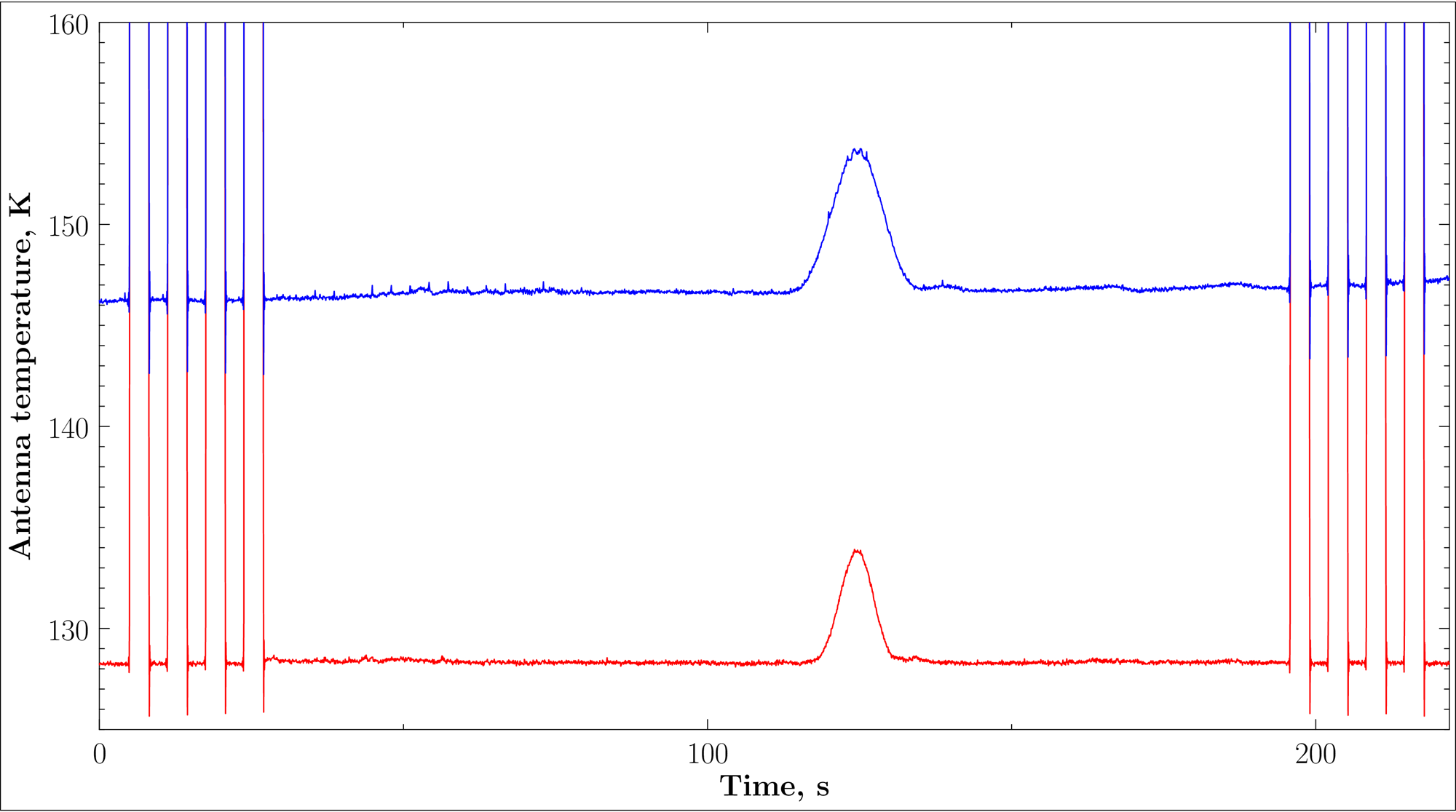 На графике представлены исходные записи в каждом из диапазонов радиометра. Видны собственные шумы, температуры системы (уровни сигнала по оси Y), калибровочные сигналы. Радиоисточник проходит через неподвижную диаграмму направленности телескопа одновременно в обоих диапазонах (работа антенны с совмещенным фазовым центром).