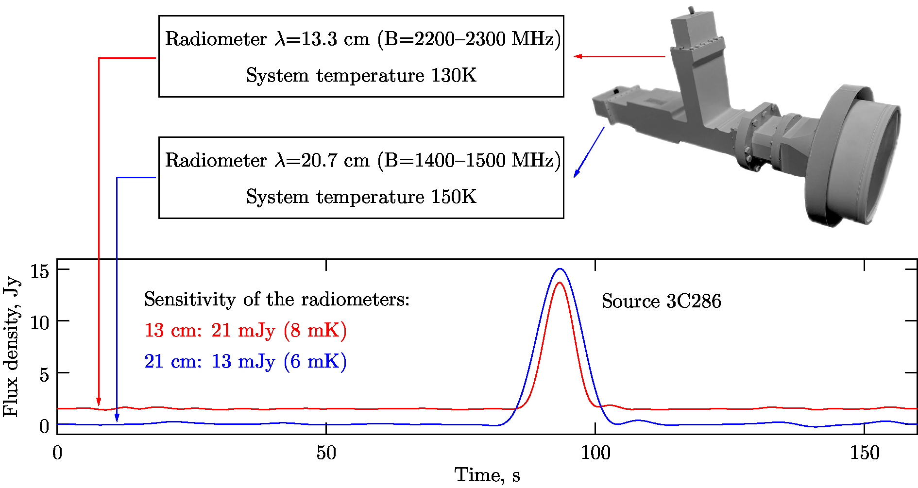 Наблюдение калибровочного радиоисточника 3С286 на новом радиометре. Красная кривая — сигнал радиометра 13.3 см (2200-2300 МГц) синяя — радиометра 20.7 см (1400-1500 МГц).