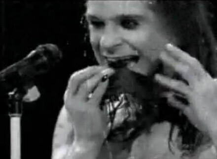 На фото - Оззи Осборн, лет 40 назад откусивший на сцене башку летучей мыши.