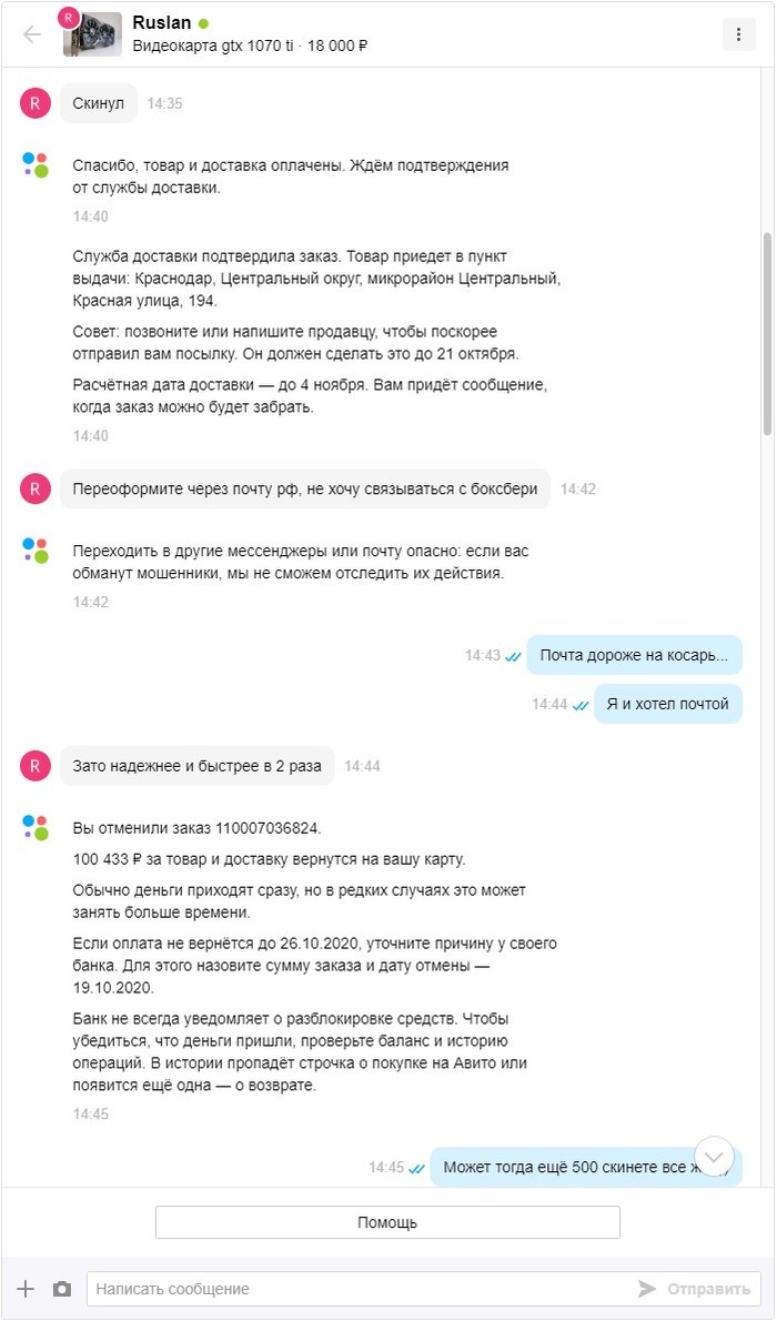 Здравствуйте, только что столкнулся с тем, что меня пытались кинуть через авито доставку. Без левых ссылок и т.д. Только чудом удалось не попасть на 100 килорублей.