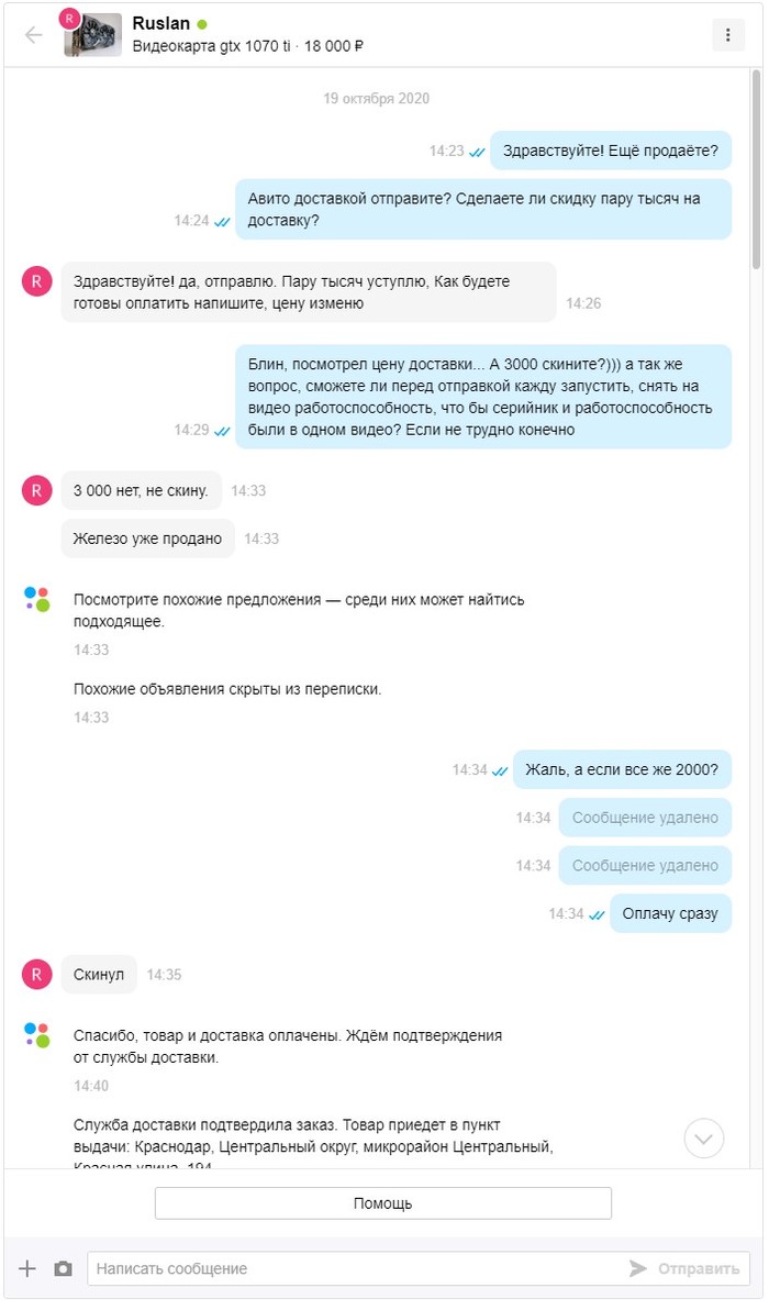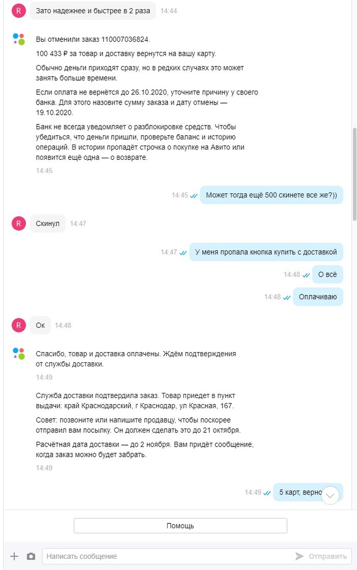 Продавец вроде адекватный, завершенные объявы были, регистрация чуть меньше года. Спросил отправит ли он авито доставкой, он согласился.
