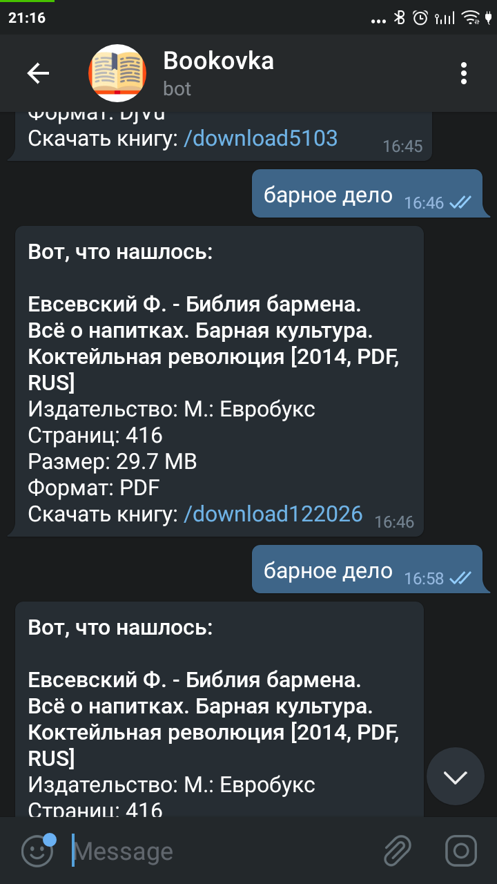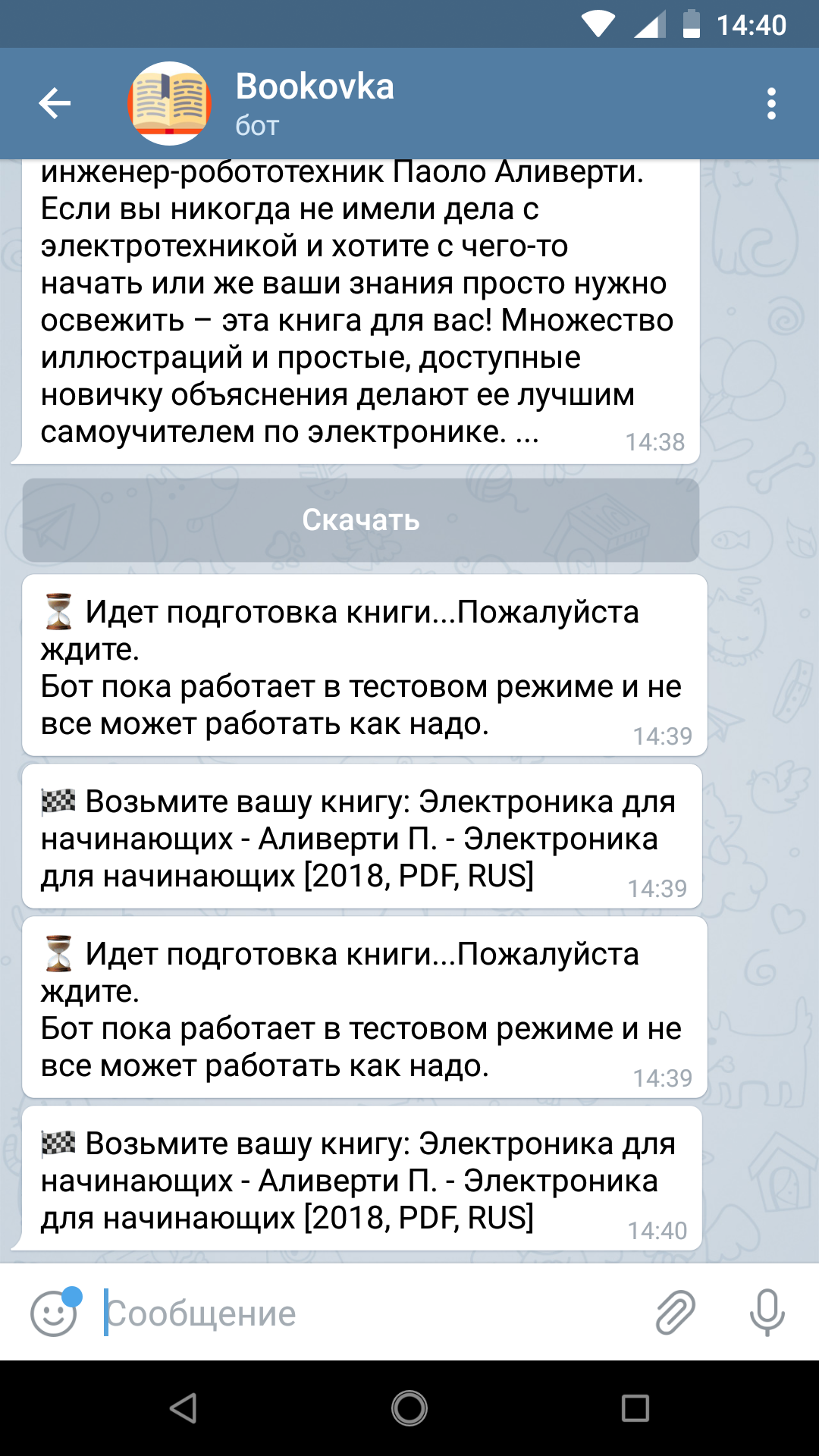МММ...а бот от флибусты уже не котируется? Молодец что создал своего бота(новый челендж и экспириенс) но тем не менее, это похоже на изобретение велосипеда)