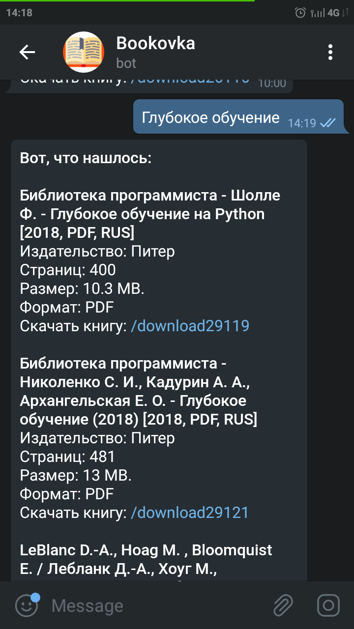 На написание своего бота меня побудила потребность быстрого поиска различной технической литературы. Я сам работаю программистом в одной из Екатеринбургских компаний, увлекаюсь машинным обучением, немного электроникой и конечно, люблю читать художественную литературу. Вначале нашел бота Флибуста, неплохой бот, достаточно много популярных книг, но почти нет книг по IT тематике. Такие книги я ищу на рутрекере, и выкачиваю торрентом. Это хорошо, когда ты работаешь с компьютера или ноутбука. Но часто я еду в дороге и смотрю лекции, где рекомендуют ту или иную книгу. Хотелось бы сразу найти ее и посмотреть содежание, предисловие. А так как я любитель Телеграм из-за его удобства и возможностей создания своих ботов для автоматизации повседневных задач, то решил почему бы не склепать робота, который содержит пополняемую базу книг, интересных мне тем, и который быстро бы смог найти и скачать необходимую книгу?