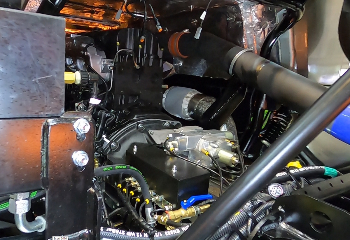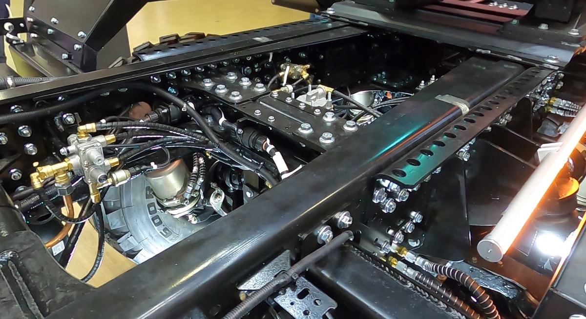 Особенность этой механики в возможности переваривать до 1900 Нм крутящего момента. В корпусе коробки передач предусмотрены возможности подключения вала отбора мощности. Масса коробки передач составляет 370 килограмм. При проектировании машины пришлось несколько раз передвигать силовой агрегат, чтобы выбрать оптимальное положение.