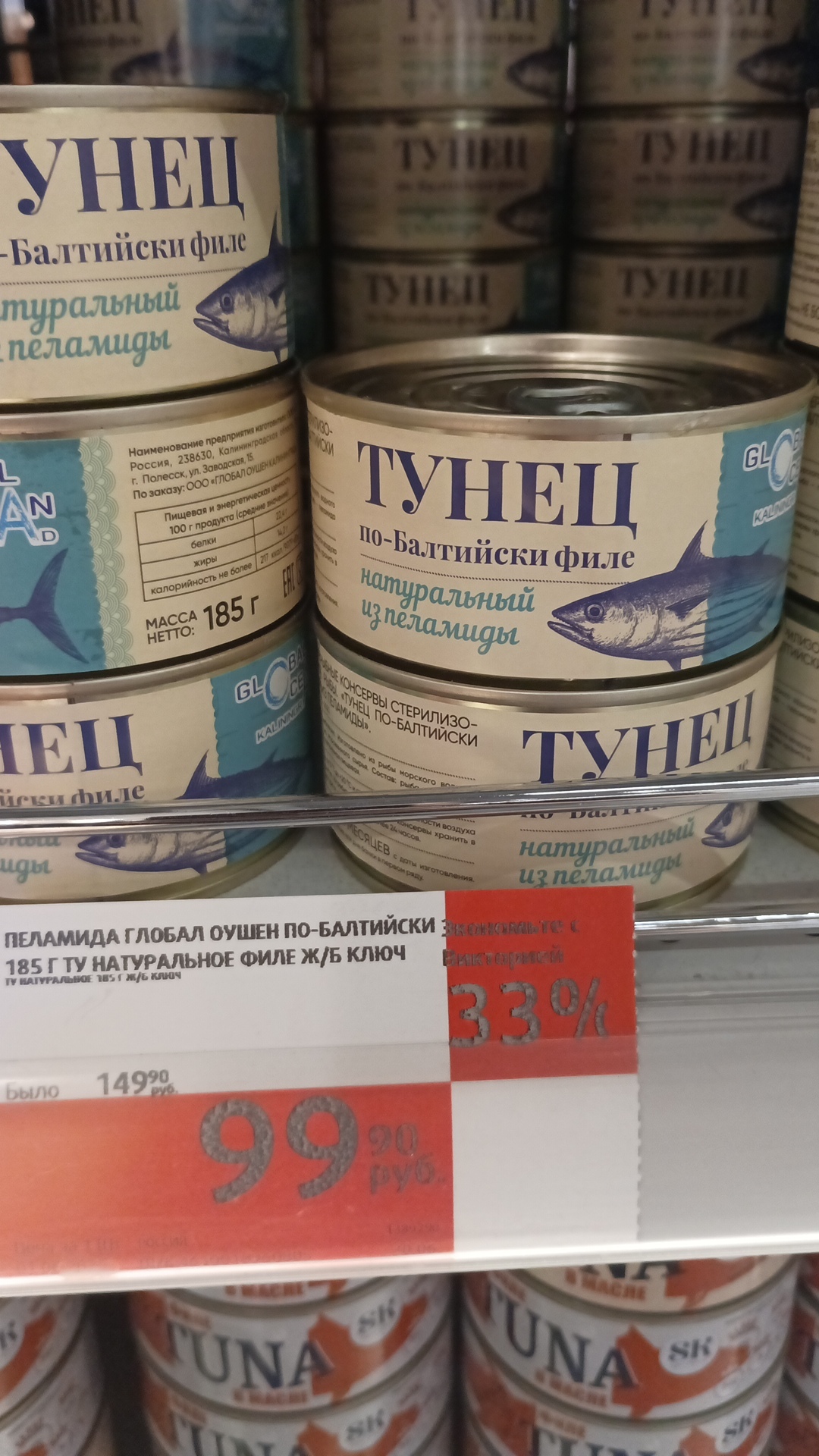 На днях шлёпал по супермаркету "Виктория" с целью прикупить чего-нибудь покушац. В глаза бросилась банка, точнее баночка, с надписью "Тунец..." и светящийся манящий акционный ценник, всего 99,9 рублей.