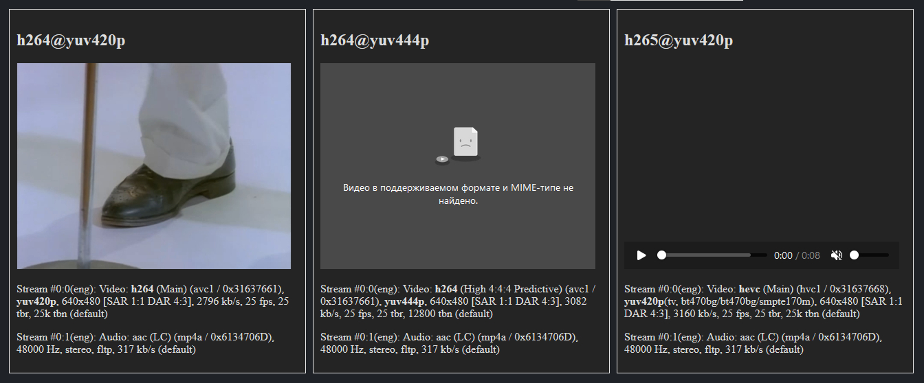 opera и яндекс.стринги, а так же в мобильном ff и мобильном хроме показывают h264@yuv420p и h265@yuv420p
