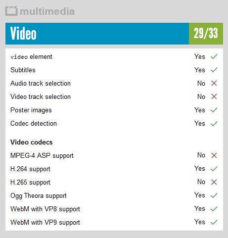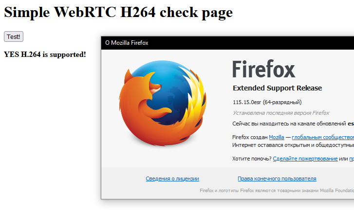 Вообще, очень странно, Firefox с 2015 года поддерживает H.264 и все тесты 115-я версия проходит, да и более старшие тоже. Уж что-то, а даже Кинопоиск-онлайн со своим DRM-шифрованием работает, а он более требователен к актуальности. В Линуксе вообще, только ESR версия.