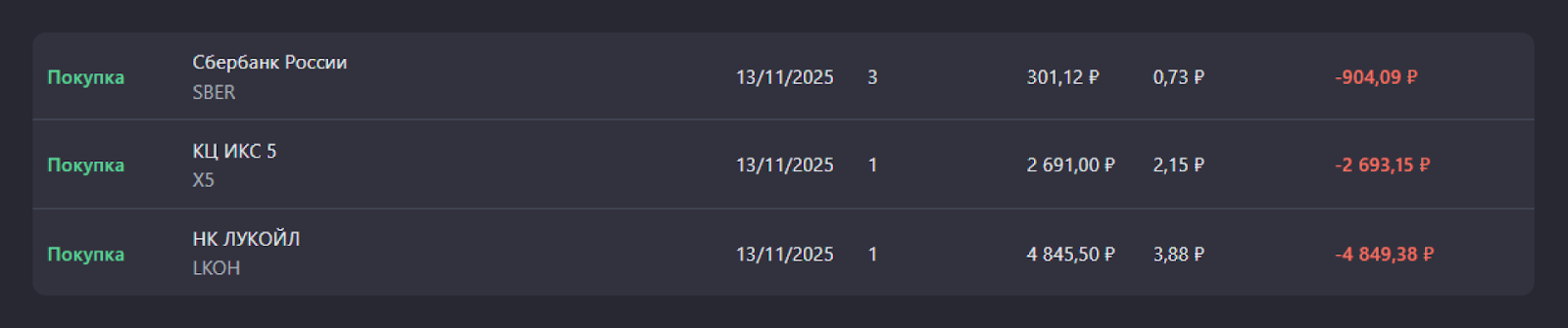 Портфель у меня был примерно на 79 000 рублей (просадка коснулась и меня), если совсем точно, то за день до пополнения было 79 376 ₽. Как и планировал, как только получил зарплату, сразу пополнил счет на +20 000 ₽. Все покупки совершены 13 октября, всё строго по плану.