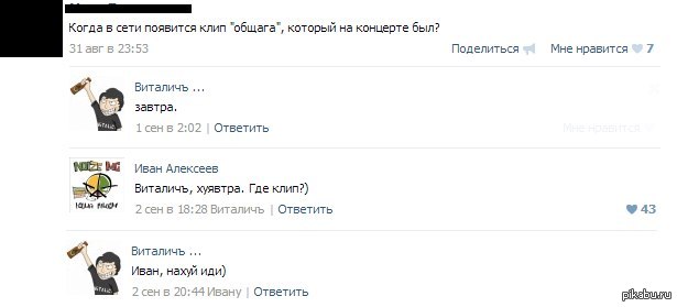 13 Hillz 11 лет назад Нойз такой Иван Переписка известного русского артиста с администратором его группы ВК. Было в сентябре 2013, так что ссылку уже не найду. [моё] Noize MC ВКонтакте Мат