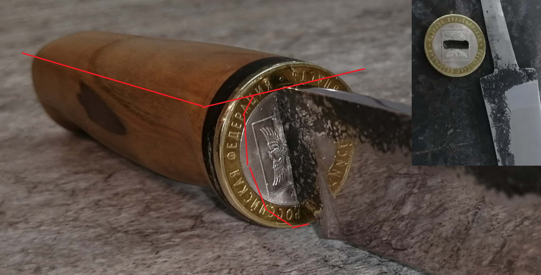 На этом и сошлись. Вопрос уперся в больстер. Из какого материала его делать. Есть еще осколки цветнометаллические, но они не совсем подходят по объему и своей рваной форме. Выписал отлитый латунный больстер под размер клина. Но, все это не то. Нет изыска. Попалась мне на глаза монет Белгородской области 2016 года. Жалко, что не 2024. Но и шестнадцатый год пойдет. Главное принадлежность к региону. Вполне символично, мне показалось. И монетка по диаметру подходит.