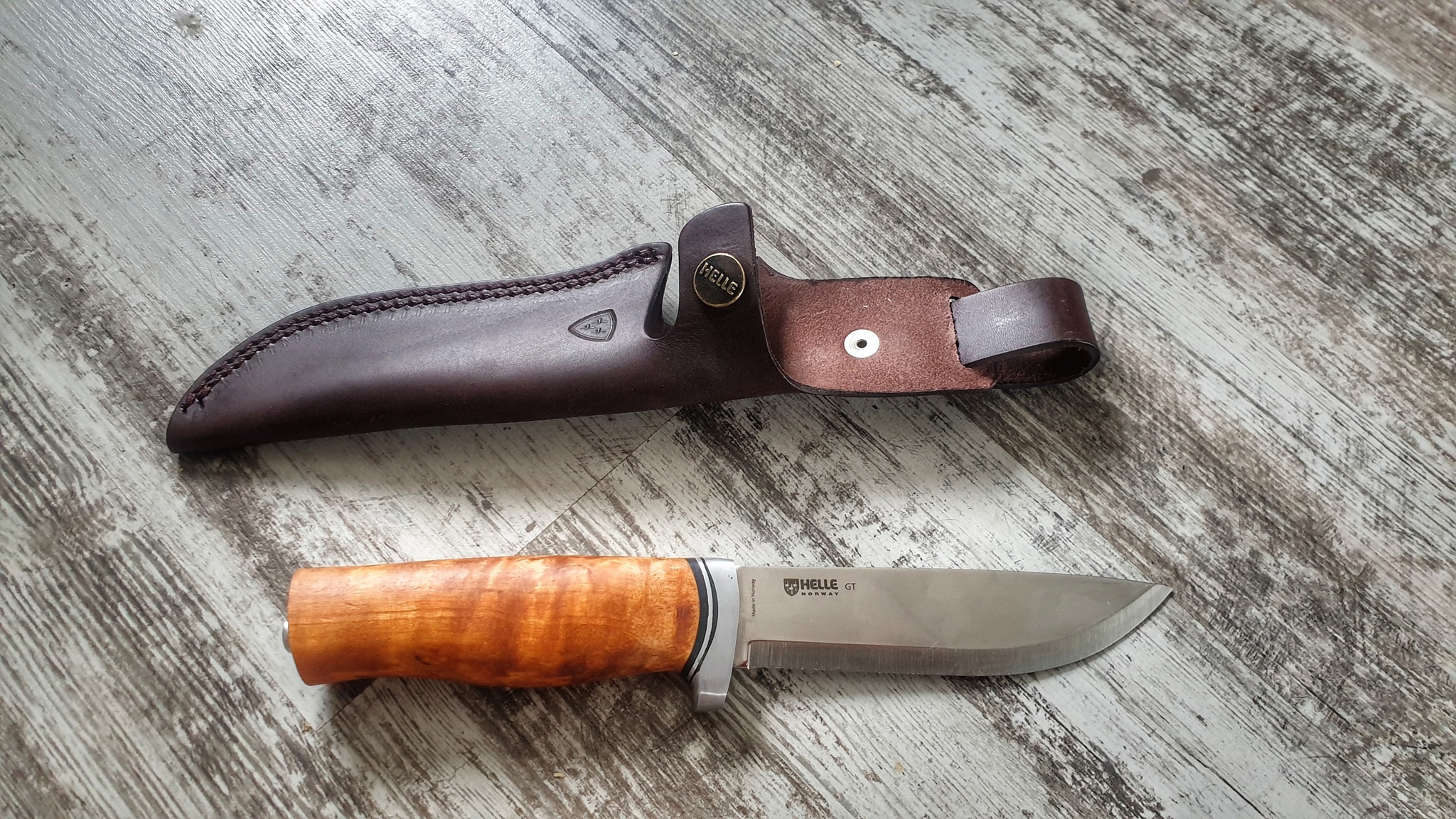 Короче, теперь у меня есть Helle GT, и я аж повизгиваю от удовольствия. Нож-исключительно рабочий, и не полочник. На клинке ламинат (кто бы мог подумать), а у Хели прекрасный ламинат, мне есть с чем сравнить: я прошлое лето прокатался по стране с Helle Viling. Придраться к стали вообще не в чем, ну, кроме того, что при разделке лука Викинг у меня пожелтел, почему-то. Не ржой, а именно яркими желтыми пятнами. А так-мегасталь, не хрупкая, не ржавеет, заточку держит. Но у Викинга есть одно спорно слабое место. Там толщина клинка 3, 8 мм, а сам он чуть больше 10 см в длину. Нож получается норм для бушкрафта, а вот режет средненько. На GT же все просто отлично: толщина по обуху 3,2 мм,а длина 123 мм. И поскольку тут сканди, то режет нож как бывшая по сердцу.
