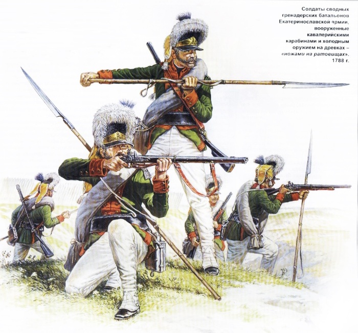 В конце XVIII века на вооружении сводных гренадерских батальонов Екатеринославской армии находилось оружие, называемое «ножами на ратовищах». Это оружие было введено по инициативе Потёмкина. 30 марта 1788 года он написал Суворову следующее письмо: «Отправил одного егеря для образца, как быть вооружену баталиону гренадерскому, находящемуся в третьей дивизии. 500 для сего ножей уже к вам отправлено чрез Херсон, а другие 500 отдайте запорожцам. Егеря обучены здесь как прицеливаться с помощью ножа. Выдумка моя ежели вас понравится, я буду рад. Вместо ружей гренадерам дайте карабины, которые стреляют лутче, нежели ружьи, а столько же далеко, будучи легче несравненно и удобнее для заряда скорого. Прикажите пули перелить по калибру карабинов, ружьи от них отобрать, выучить стрелять в цель и ножами, вместо штыков, колоть и рубить вместо сабли».
