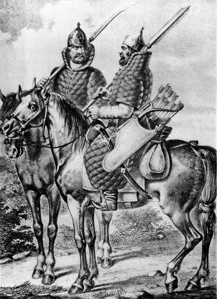 Ратники в тегиляях и шапках железных (левый — с совней, правый — с рогатиной)