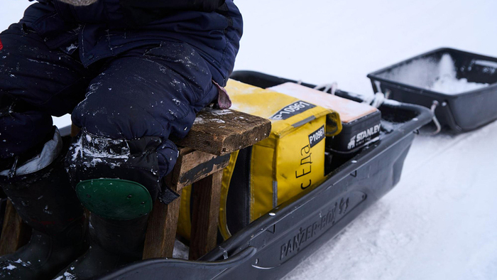 Сергей работает на вахте в другом регионе, а в свободное от смен время ездит на рыбалку на снегоходе. Улов бережно складывает в сумку курьера Яндекс.Еды, оставшуюся с прошлой работы. В его санях по селу перемещается и пойманная рыба, и местные дети