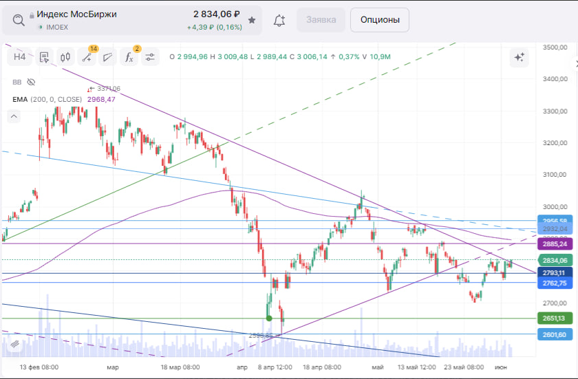 Ожидания снижения ключевой ставки на заседании ЦБ РФ 06 июня, а также тот поджим, который рисует индекс, сильно повышают вероятность того, что среда и четверг на этой неделе будут растущими.