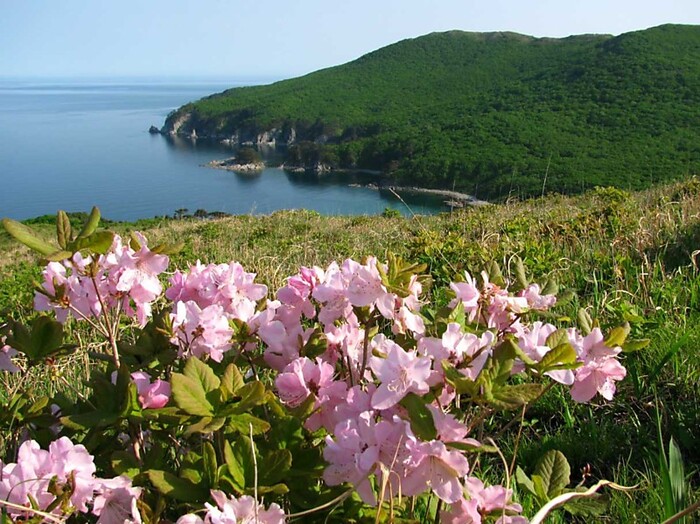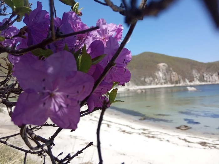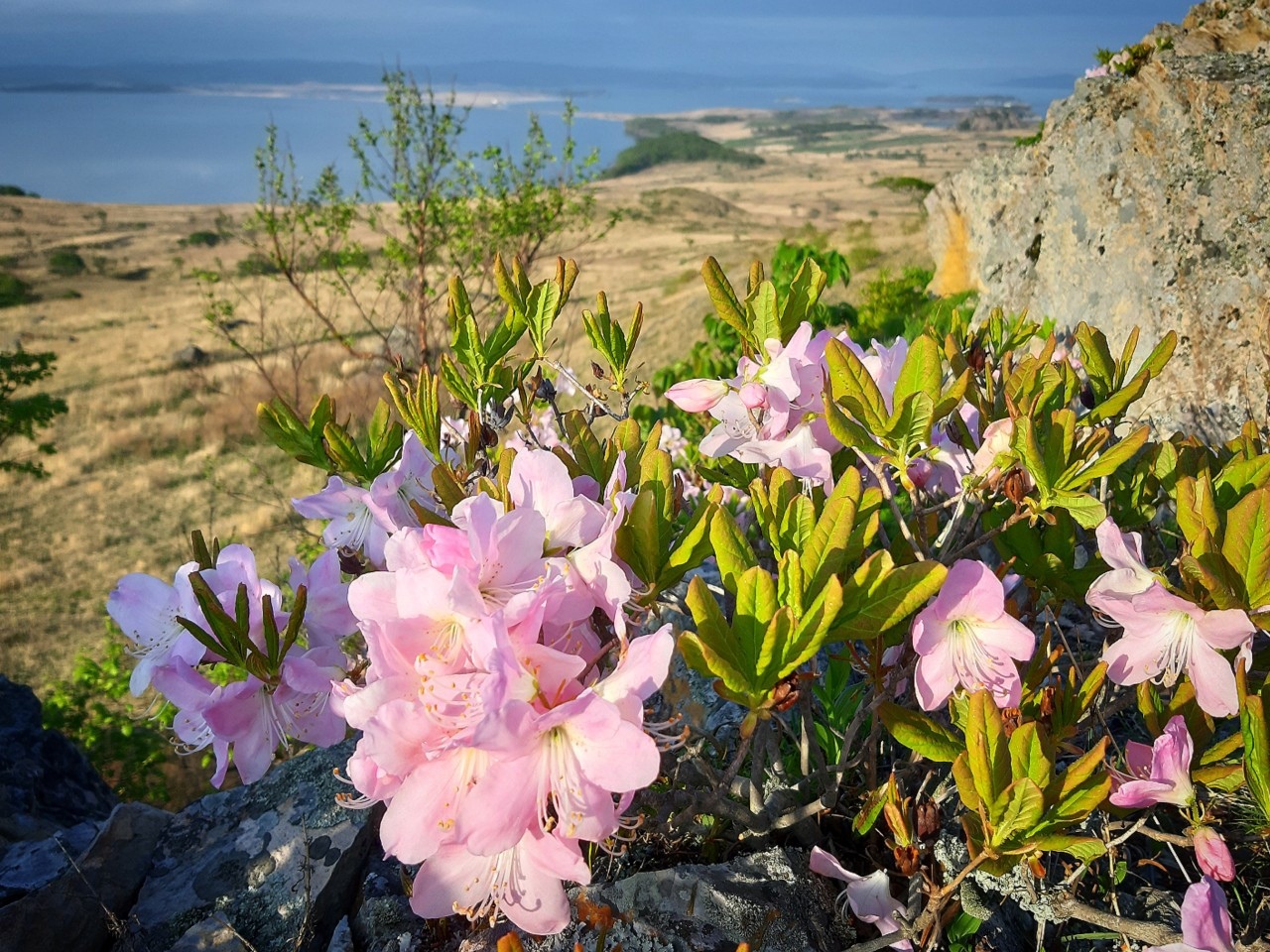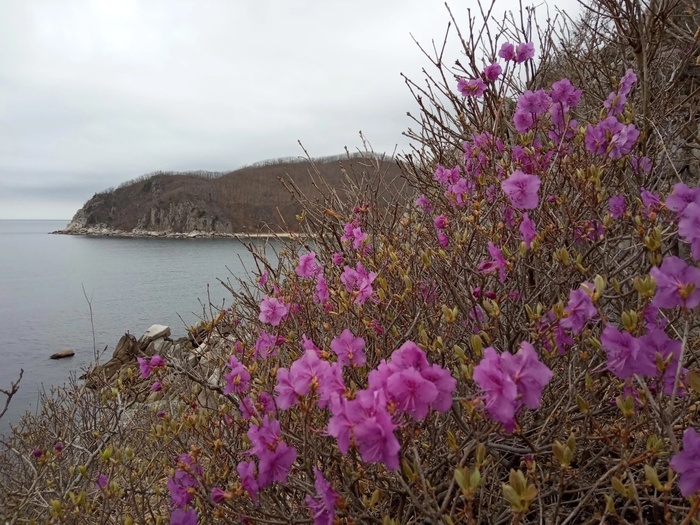 Апрель и май в Приморье - самое время, чтобы дышать вкусным весенним воздухом и любоваться на яркие лило-розовые пятна на фоне скал и синего моря. Здешний сезон ханами -- это больше про цветение рододендрона.