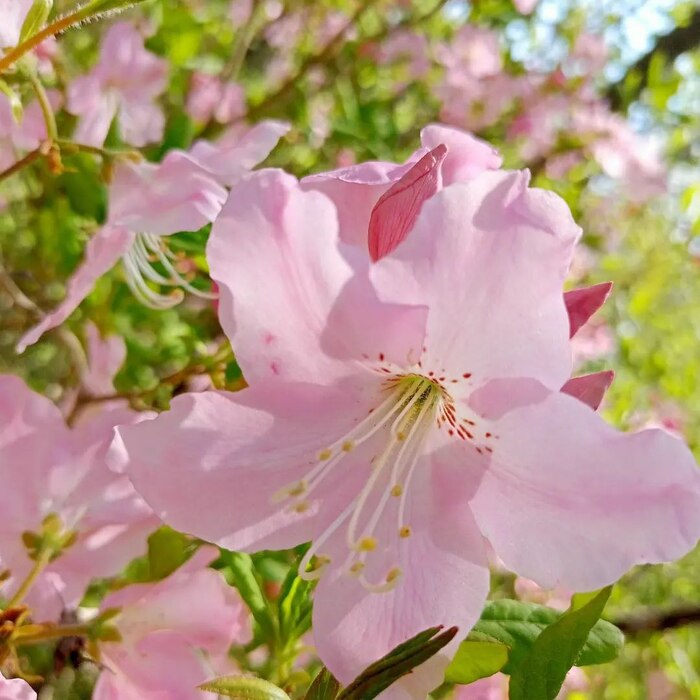 И, наконец, дождавшись приятного тепла и зелени, расцветает рододендрон Фори.