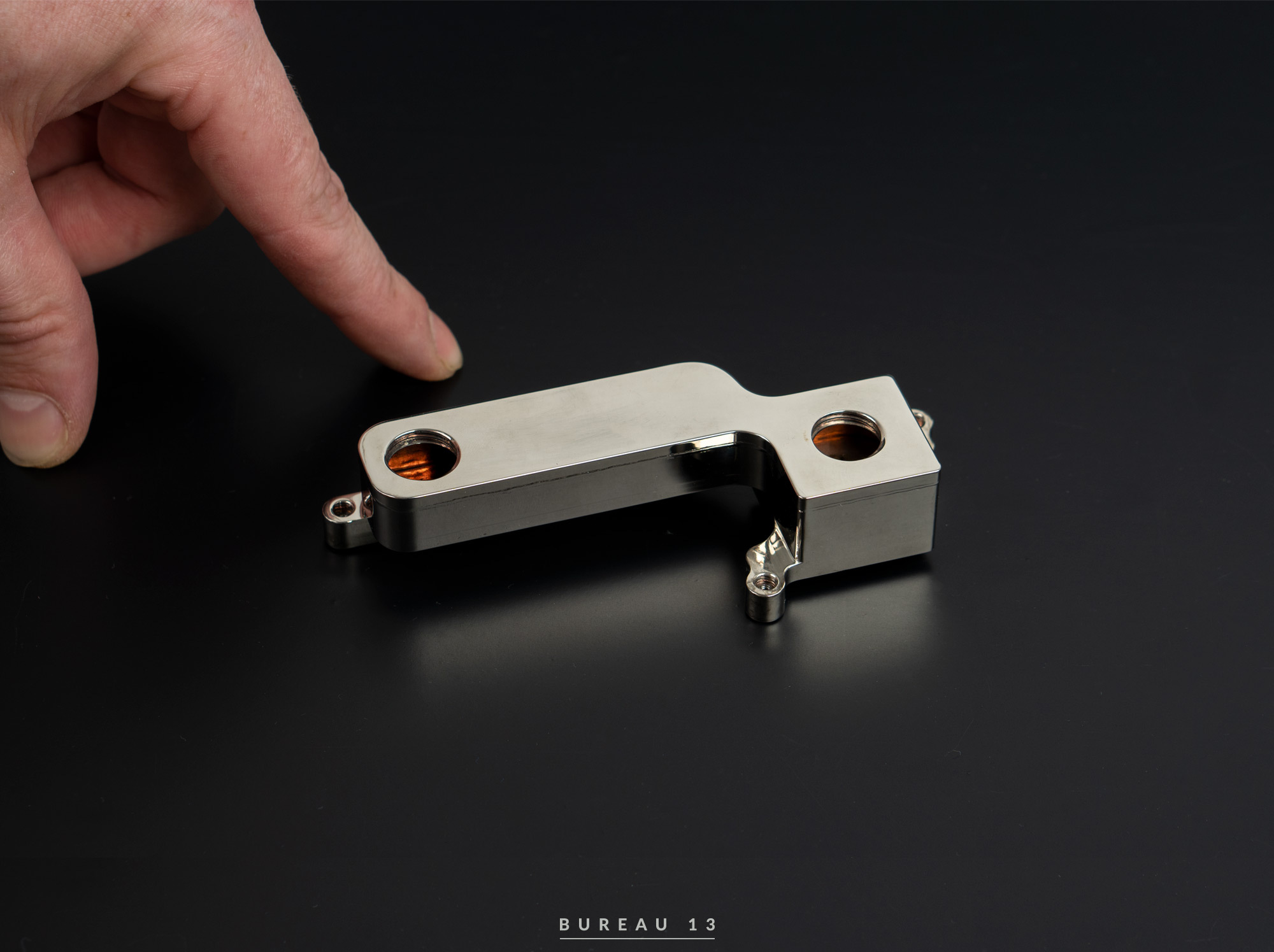 Интересное задание для кастомного компьютера. Водный радиатор охлаждения, объединяющий две точки отбора тепла в одно тело. Сделан методом фрезеровки из плиты меди. Дальше сварен лазером в одно тело, отполирован вручную и покрыт никелем, проверен на герметичность. Встал как родной, заказчик доволен, говорит работает очень хорошо, большой запас теплоемкости.