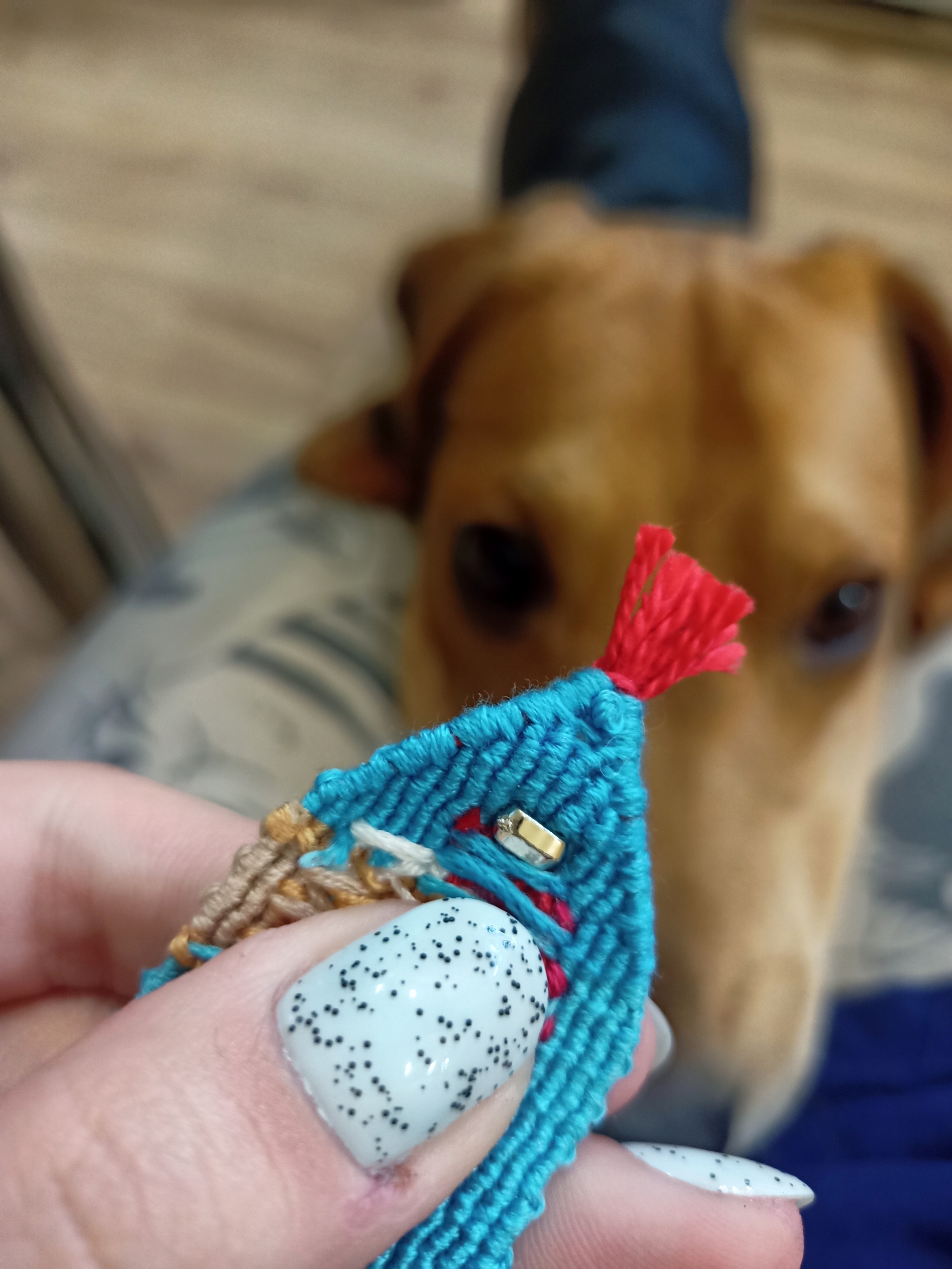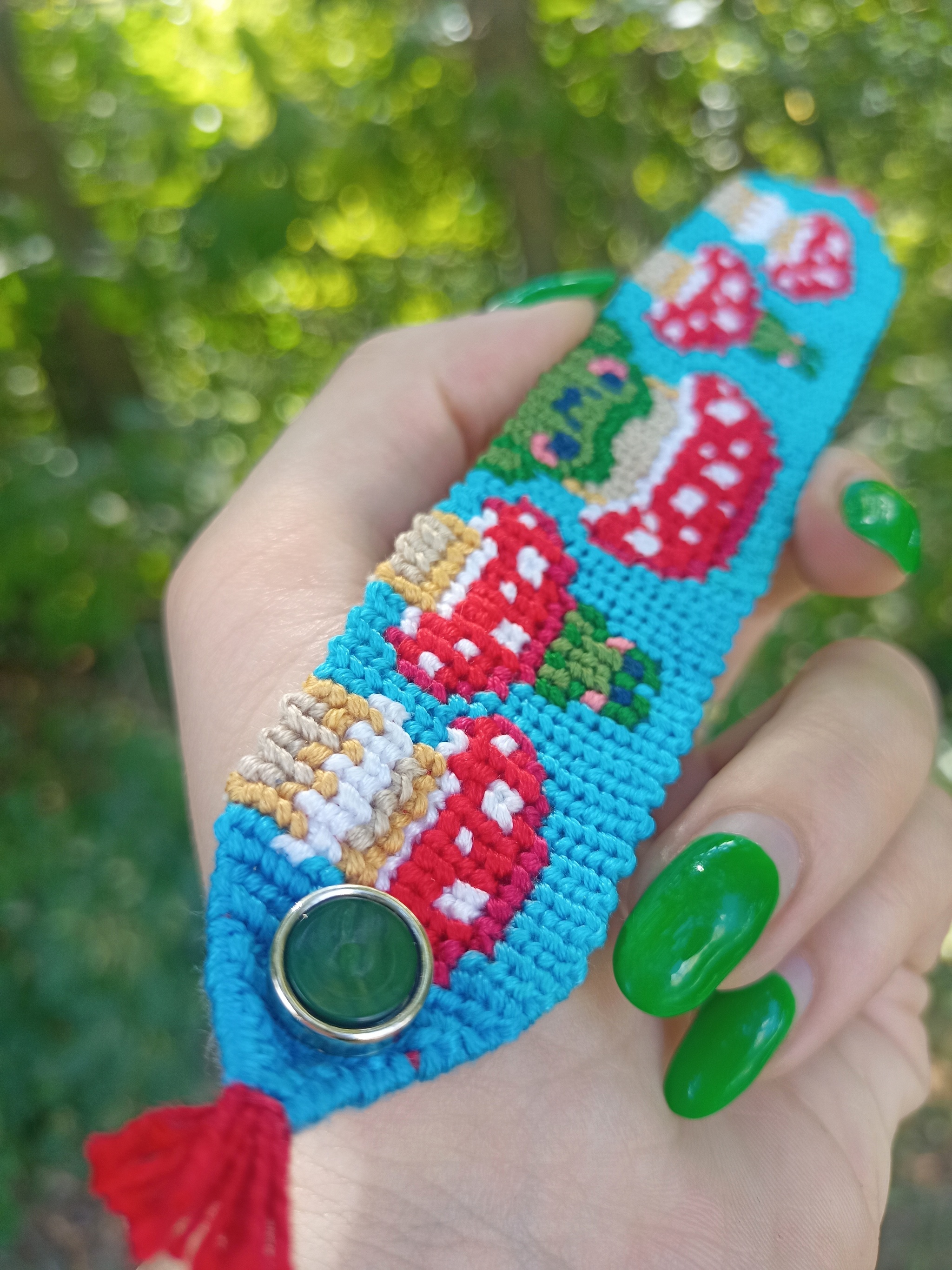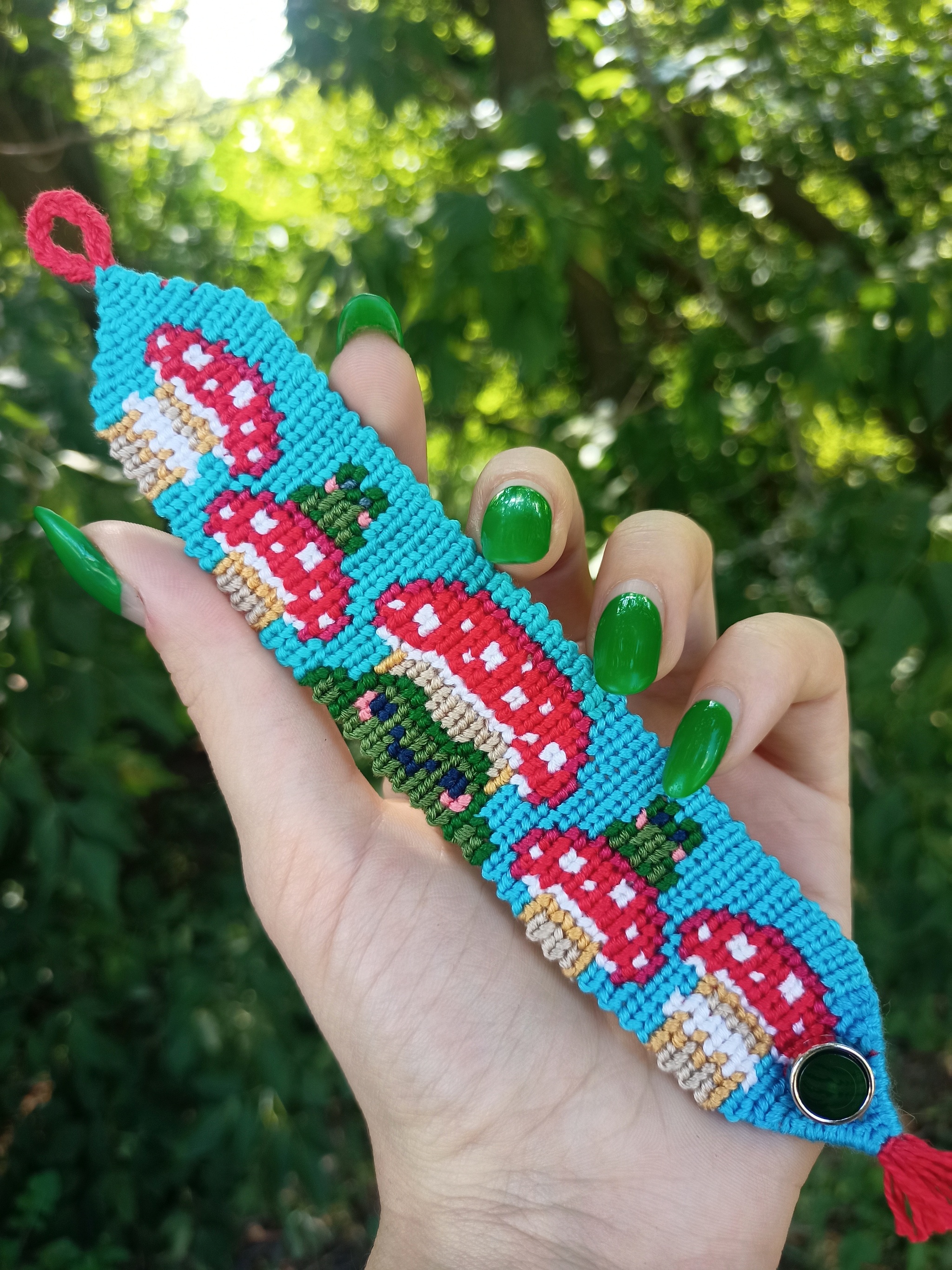 Если в прошлой фенечке пуговка была мерой вынужденной, то тут замысел изначально был таким. Даже пуговицу специально искала, но до последнего не могла выбрать: красную, голубую или зеленую вставить. Остановилась на зеленой.