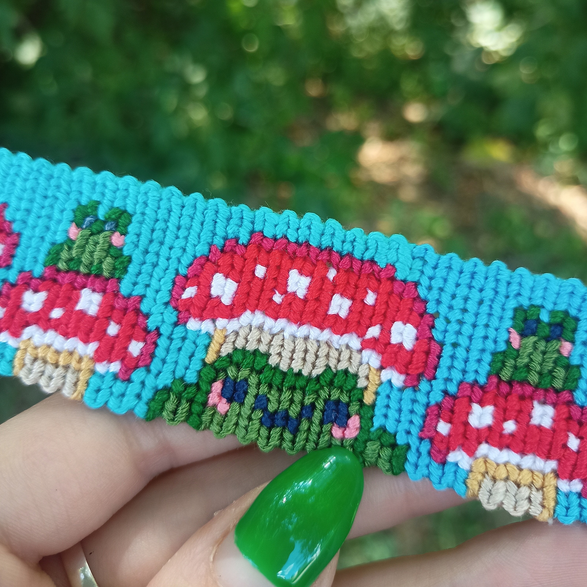 Еще из неприятного: мне иногда отшибает память, и на каком-то автомате я делаю странные перетяжки цвета в местах, где один цвет идет горизонтальной линией, как в верхушках гриба. Там, получается, нить цвета никуда не уходит, оплетает одну и ту же нить основы несколько рядов подряд, не закрепляется другими нитями, и если ее принудительно не закрепить, то там будет щелочка в полотне. Раньше я довольно успешно протягивала их над ниткой основы, а сверху заплетала другим цветом, даже туториал для друзей записывала, а сейчас что-то не получается так аккуратно. Поэтому у первого гриба появились странные наросты в тех местах, где я нитку цвета утаскивала. Ко второму грибу я вспомнила, как переплетать нитки, чтобы и держались, и не торчали.