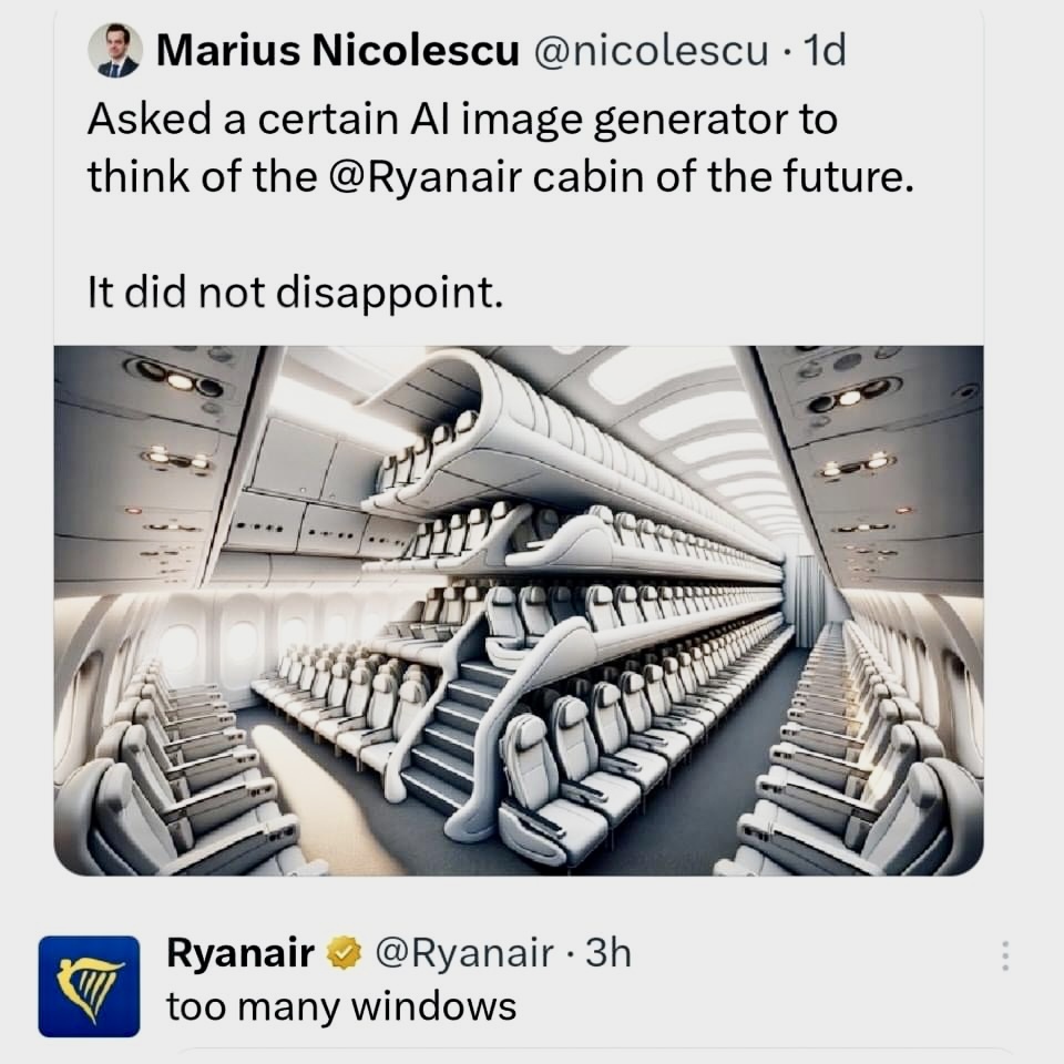 24 Wildwildworld 1 год назад Юмор для всех и каждого Ну, хоть честно Мариус Николеску: Попросил определенный АИ - генератор придумать кабину будущего Ryanair Ryanair: слишком много окон Ryanair - бюджетная авиалиния предоставляющий базовый сервис и славящаяся дополнительными сборами практически за все Скриншот Ryanair Юмор 2 Ещё 0