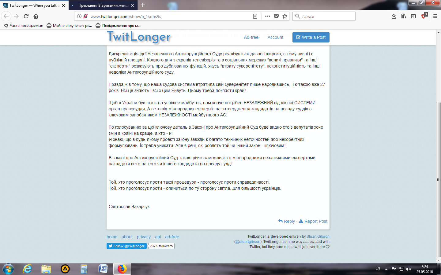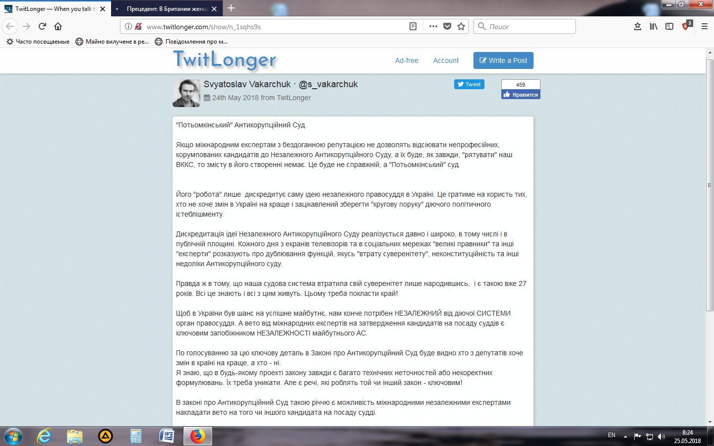 Его "работа" только дискредитирует саму идею независимого правосудия в Украине. Это будет играть в пользу тех, кто не хочет изменений в Украине к лучшему и заинтересован сохранить "круговую поруку" действующего политического истеблишмента.