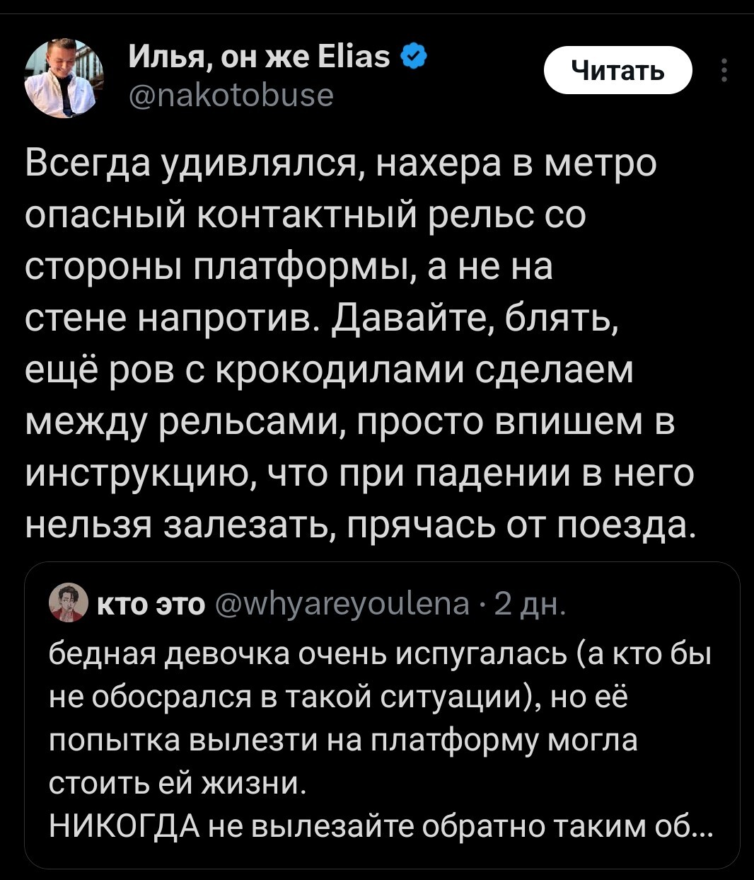 7 BaronSimon 12 часов назад Ну правда, зачем было делать такую ловушку? Московское метро Скриншот Threads 3 Ещё 0
