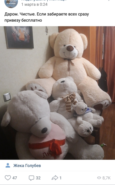 Где-то в обсуждении похожего подарка в комментариях меня закидали тапками девчонки, мол им нравится все и их армия плюшевых пони и медведей смотрит на меня с осуждением. А я вот не понимаю пошто такая радость дома, у меня даже места много, можно хоть 10 таких медведей поселить. Но зачем? Что с ними делать? Перекладывать с места на место? А потом когда кавалер поменялся и новый опять несёт тебе игрушки и так ещё пару раз, то получается какой то странный плюшевый алтарь 😬