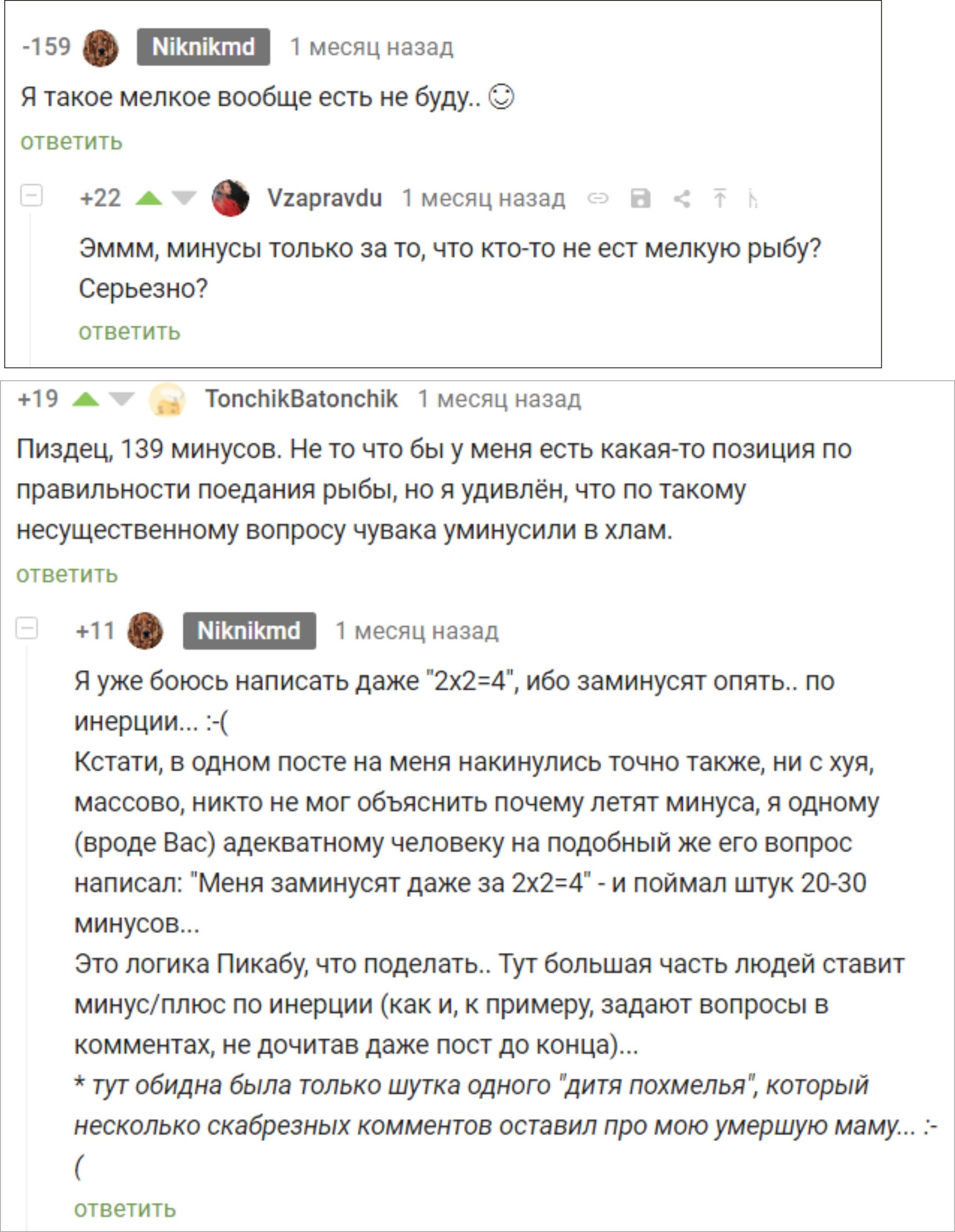 Я получил свыше 400 минусов за простое мнение: "Я бы эту рыбу не кушал" (про какую-то сушёную рыбку)...