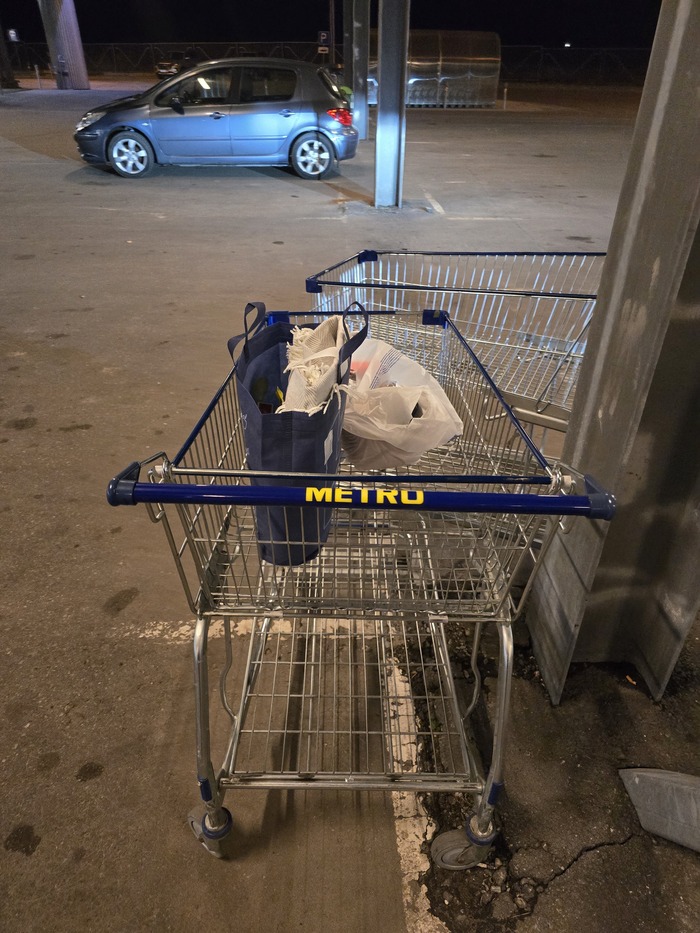 Дочка (2 года) говорит, что описалась. Запасные штаны в домике. Идёт в домик, забирает штаны. К этому времени я уже подъехал к магазину, удивительно, но пакеты лежат в тележке на улице около входа их даже никто не тронул, когда их там оставил время было 7 вечера, приехал в 10.