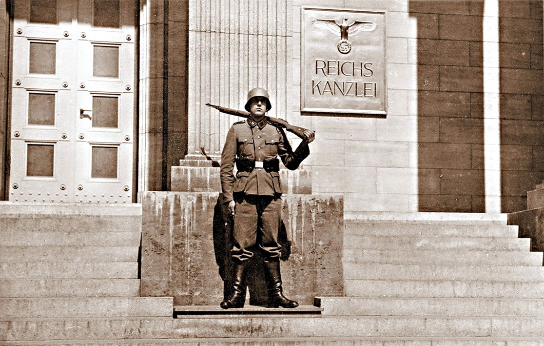 Вывеска на новой Рейхсканцлерии (Neue Reichskanzlei), канцелярия Гитлера на Фосштрассе, Берлин, май 1945 года. Из телеграмма Баира Иренчеева