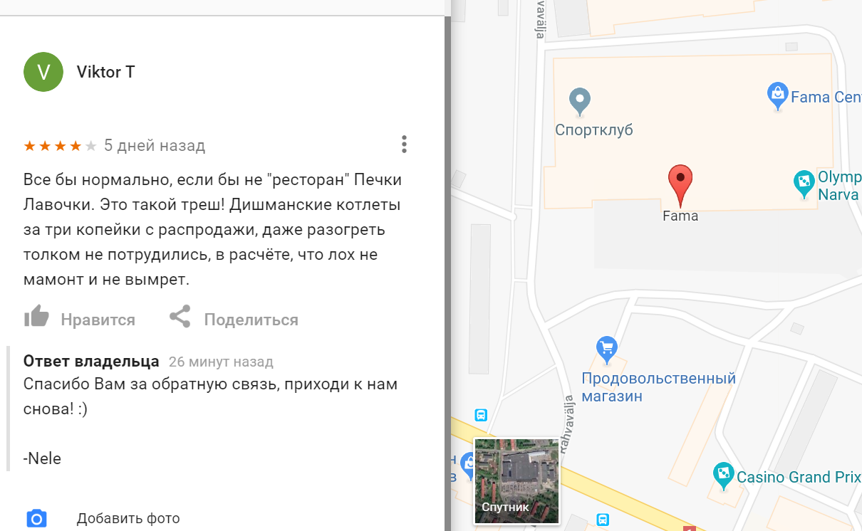 Есть у нас торговый центр. Гугел решил проявить интерес к моему визиту туда, ну и спросил оценку. Мне не жалко, но пришел ответ от владельцев. Оценивайте сами. Место Нарва, торговый центр Фама, забегаловка, по какой-то неведомой причине называется ресторан( ну бред ведь).