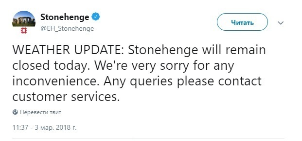 а не поехали, потому что в этот день он закрыт был из-за той самой ЖЫЖЫ. https://twitter.com/EH_Stonehenge/status/969854381586878464