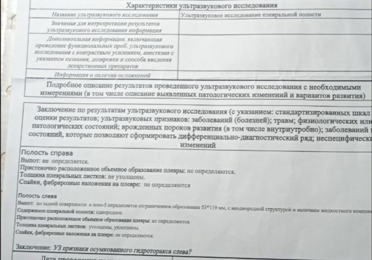 УЗИ плевральной полости - признаки осумкованного гидроторакса слева (под вопросом)