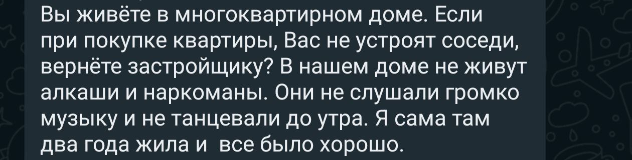 В общем, хозяйка вместо того, чтобы помочь хотя бы разговором с соседями (есть общедомовой чатик), говорит, что это нас там что-то не устраивает и ей было норм.