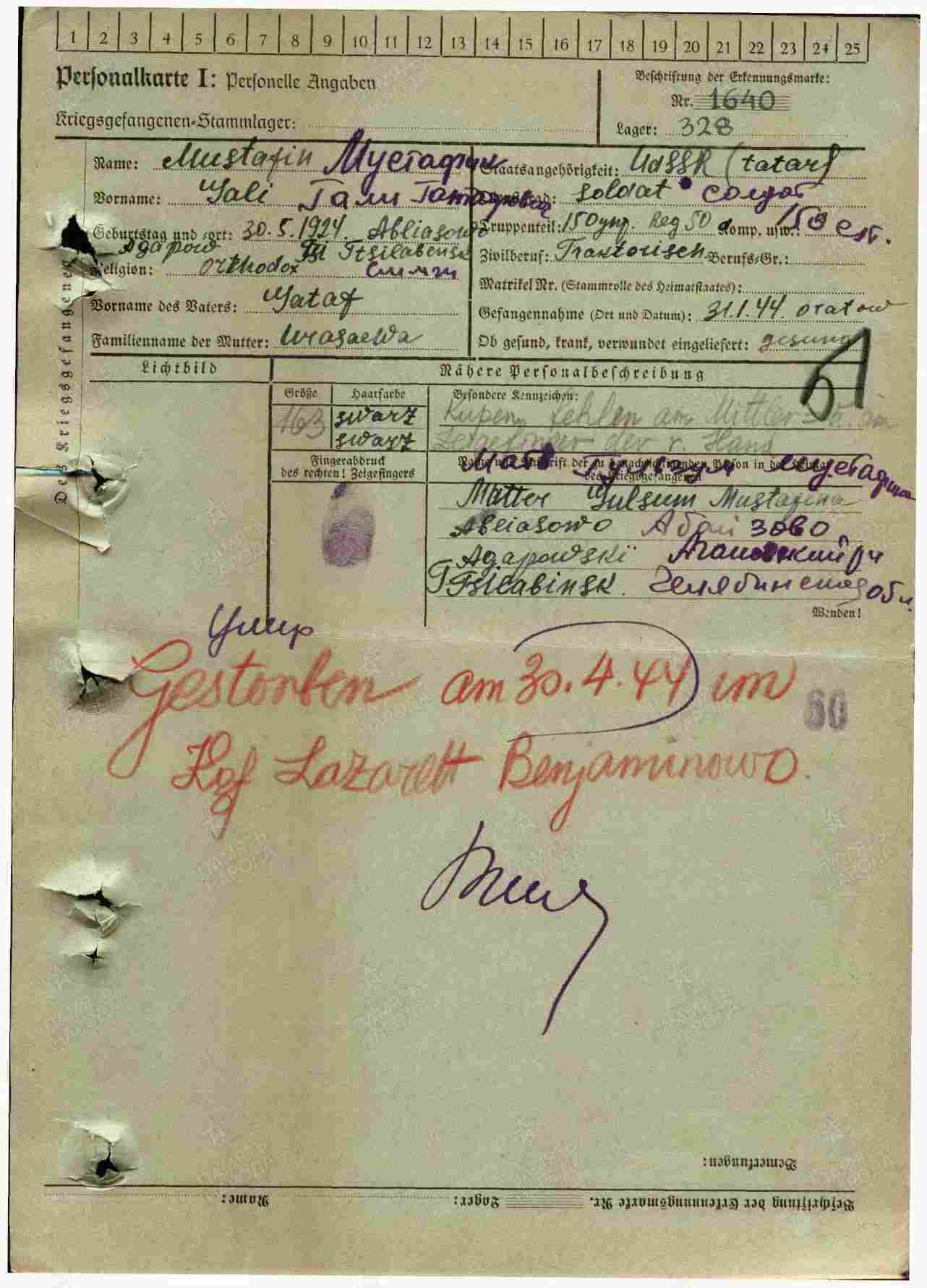 Эта информация представлена на сайте ОБД Мемориал. Но дело в том, что в этом году на сайте базы данных военнопленных я нашла о нем информацию, но представился он как Мустафин Гали. При переводе карточки неверно указано отчество Мустафин Гали Гатафович. Идентификационный номер 301087.