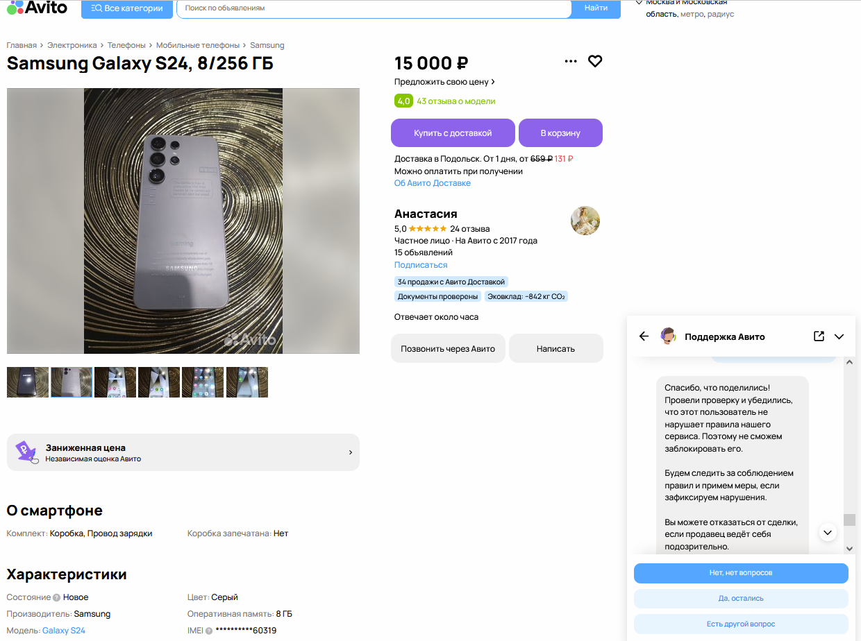 Столкнулся тут несколько часов назад с забавной ситуацией. В поисках Samsung Galaxy S24 на Авито поиск выдал мне откровенную подделку за 15 000 руб., когда новый оригинальный стоит не менее 52 000 на площадке. Более того, даже фото задней стороны уже откровенно говорит, что речь о пали (см. скриншот).