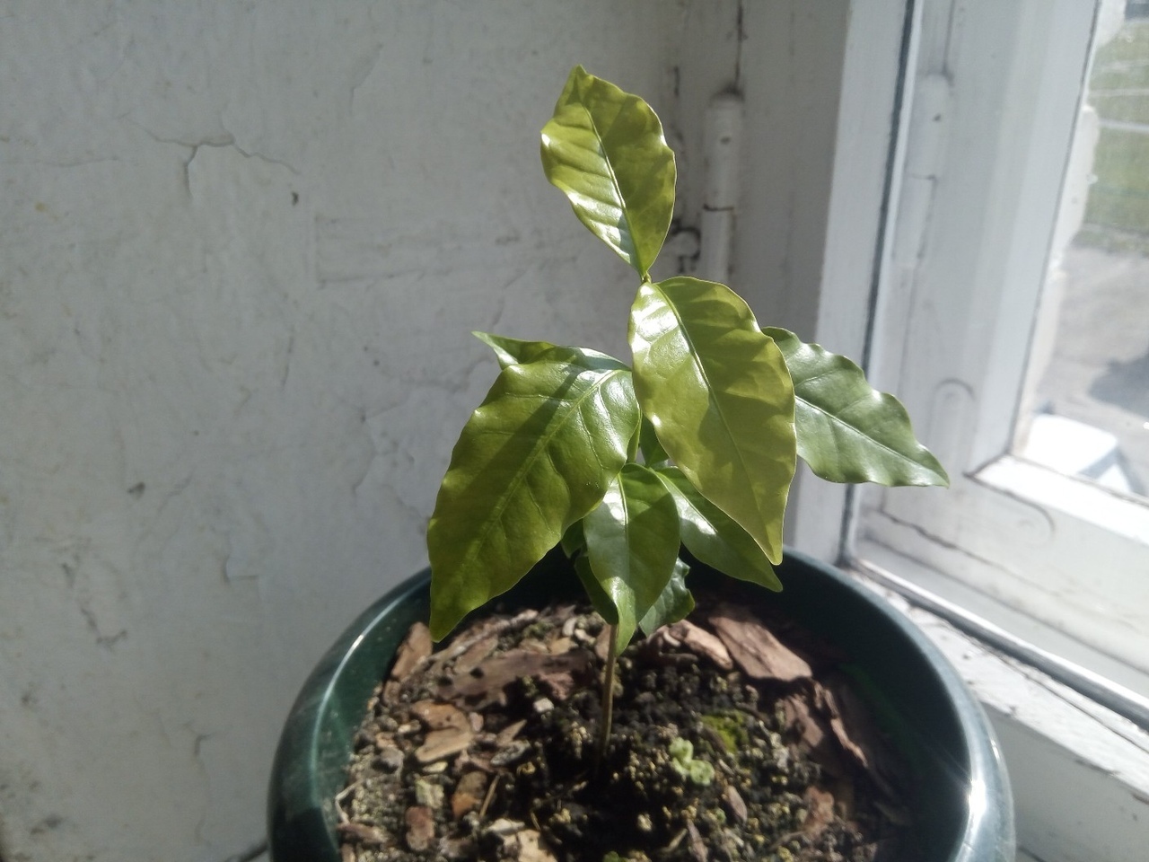 Друг на подоконнике вырастил кофе. Да, деревце - карликовый арабский кофе.А вот под деревцем начал расти непонятный зелёный товарищ. Может кто знает имя этого соседа?