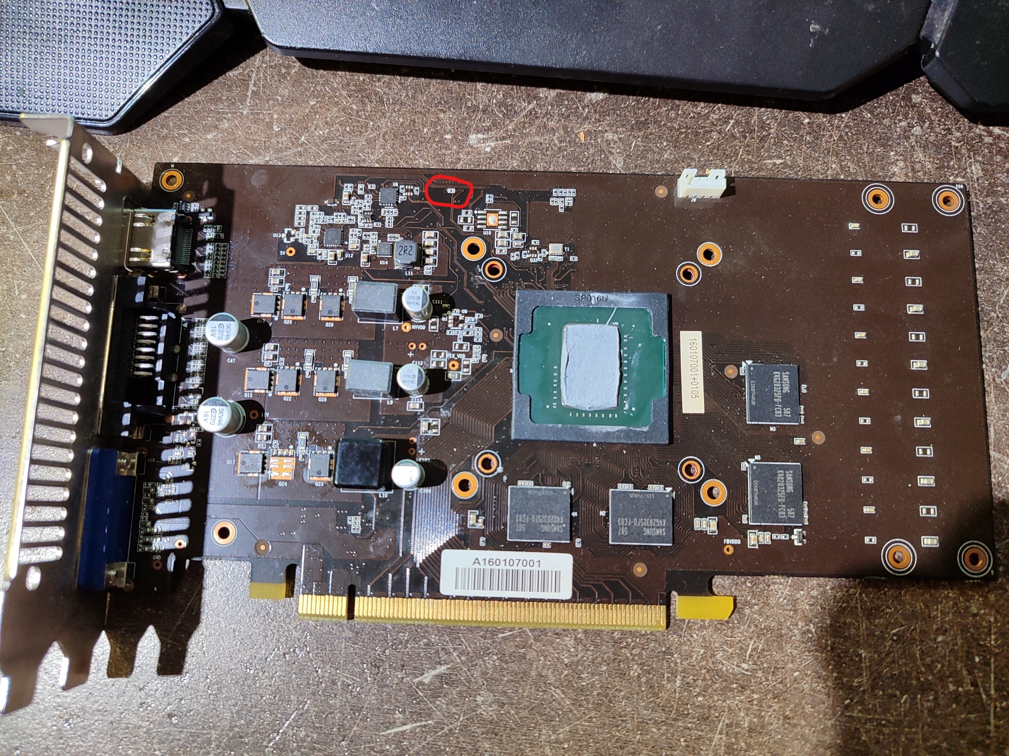 Добрый день уважаемые ремонтеры, нужна помощь в определении сбитого элемента на видеокарте Palit Geforce GTX 750 1g, нет никаких обозначений что за элемент там стоял, видеокарта условно была рабочая, в диспетчере устройств определялась, но с желтым треугольником и восклицательным знаком. Помогите пожалуйста, паяльник держать умею, руки немного кудрявые, но куда без этого.