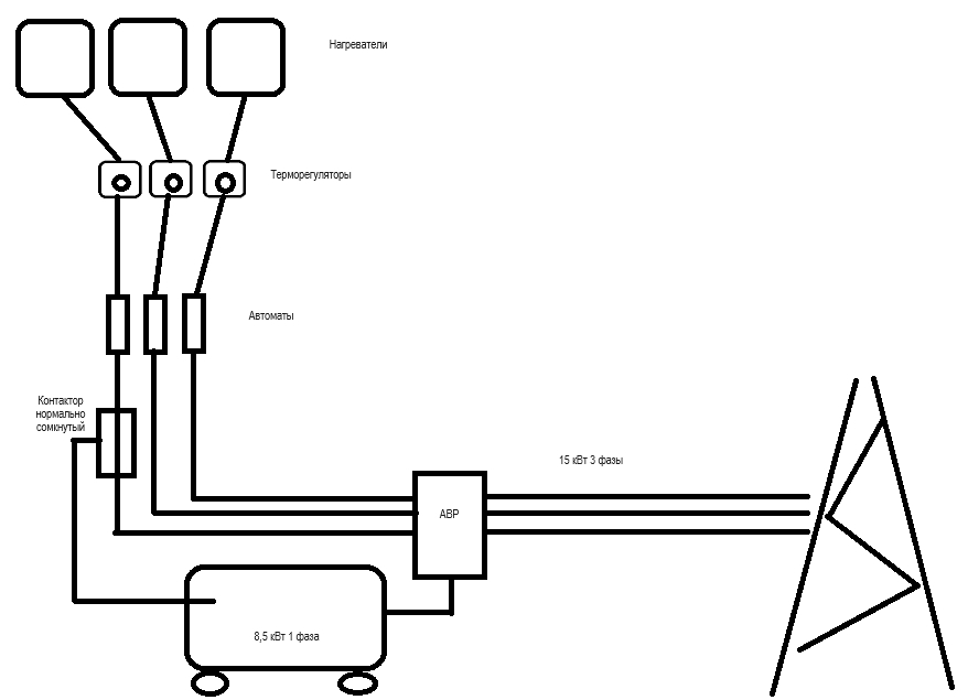 Живу в частном доме, где отопление сделано полностью электрическими конвекторами. Дома подключено 15 квт и есть генератор с авр на 8,5 квт. Поскольку все конвекторы управляются терморегуляторами, то шанс, что они все работают действительно одновременно, низкий. Но в лютые морозы такое все же происходит. Тем не менее, 15 квт хватает на все. Однако в жуткие морозы, видимо весь ближайший частный сектор включает отопительные приботы и электричество в районе отрубается. Тогда у меня заводится генератор и в основном я счастлив, но в жуткие морозы 8,5 квт не достаточно, чтобы потянуть все отопление в доме и генератор автоматически глохнет. Тогда я остаюсь вообще без электричества и мне приходится ходить и вручную отключать лишние обогреватели, чтобы остались только те, что в спальнях. Вот это я и хотел автоматизировать. В генераторной есть розетки только от сети, только от генератора, и общая линия.