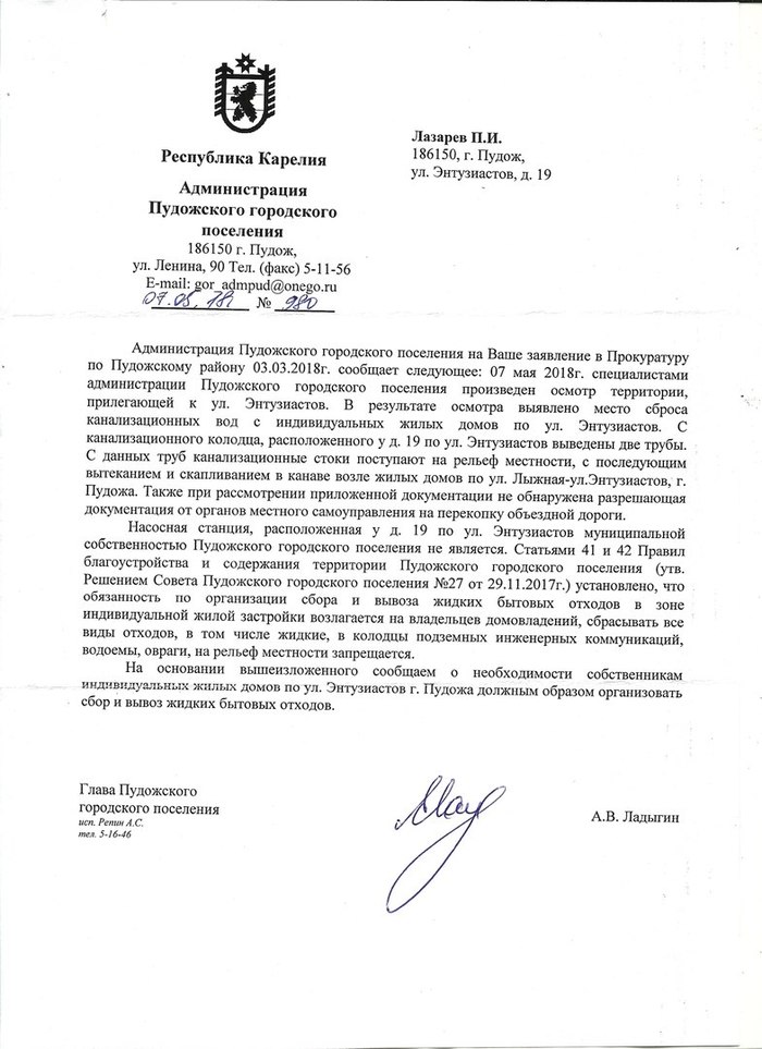 Жильцы обратились в прокуратуру, предписание сняли, но началась холодная война.Обращение из прокуратуры республики разошлось в Росприроднадзор, который все эти годы, несмотря на обращения, соблюдал нейтралитет, Министерство природопользования и экологии, Госжилинспекцию. Отписки об отсутствии компетенции в данном вопросе выкладывать не буду (сканы есть).