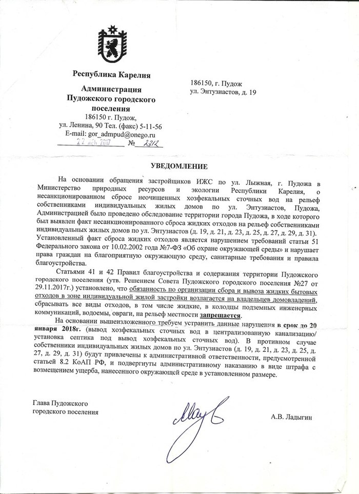В декабре 2017 жителям пришли предписания из администрации города - установить септики до 20 января 2018. Иначе штраф.
