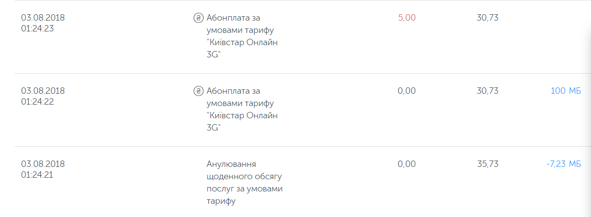 Каждый месяц, ночью, примерно между 00:00 и 03:00, оператор снимает неизрасходованные мегабайты, начисляет новые, и снимает абонплату. Если денег на счету недостаточно, снимает 5 гривен в день.