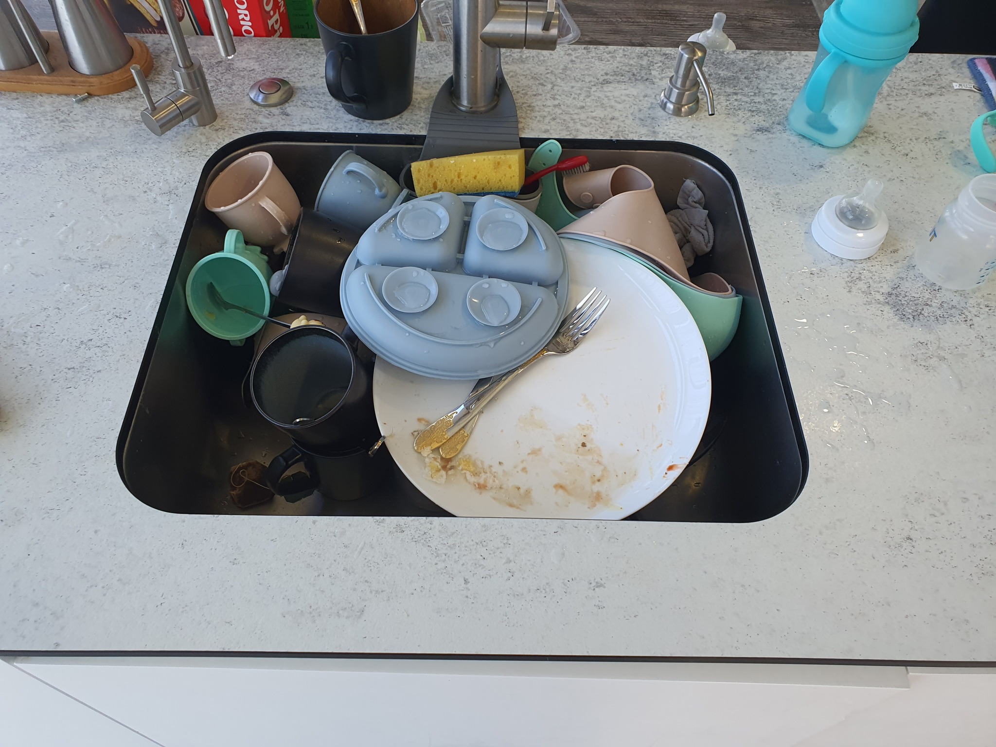 Пока супруга дома, просим её переодеть красавцев. Утренний туалет проходит в раковине. Взял, принёс, посадил, помыл, унёс, вытер, надел подгузник. Повторить 3 раза. Пока у детей банные процедуры наводим порядок на кухне. Детки кушают с силиконовой посуды, удобная. А воротники и вовсе незаменимы. Рекомендую.