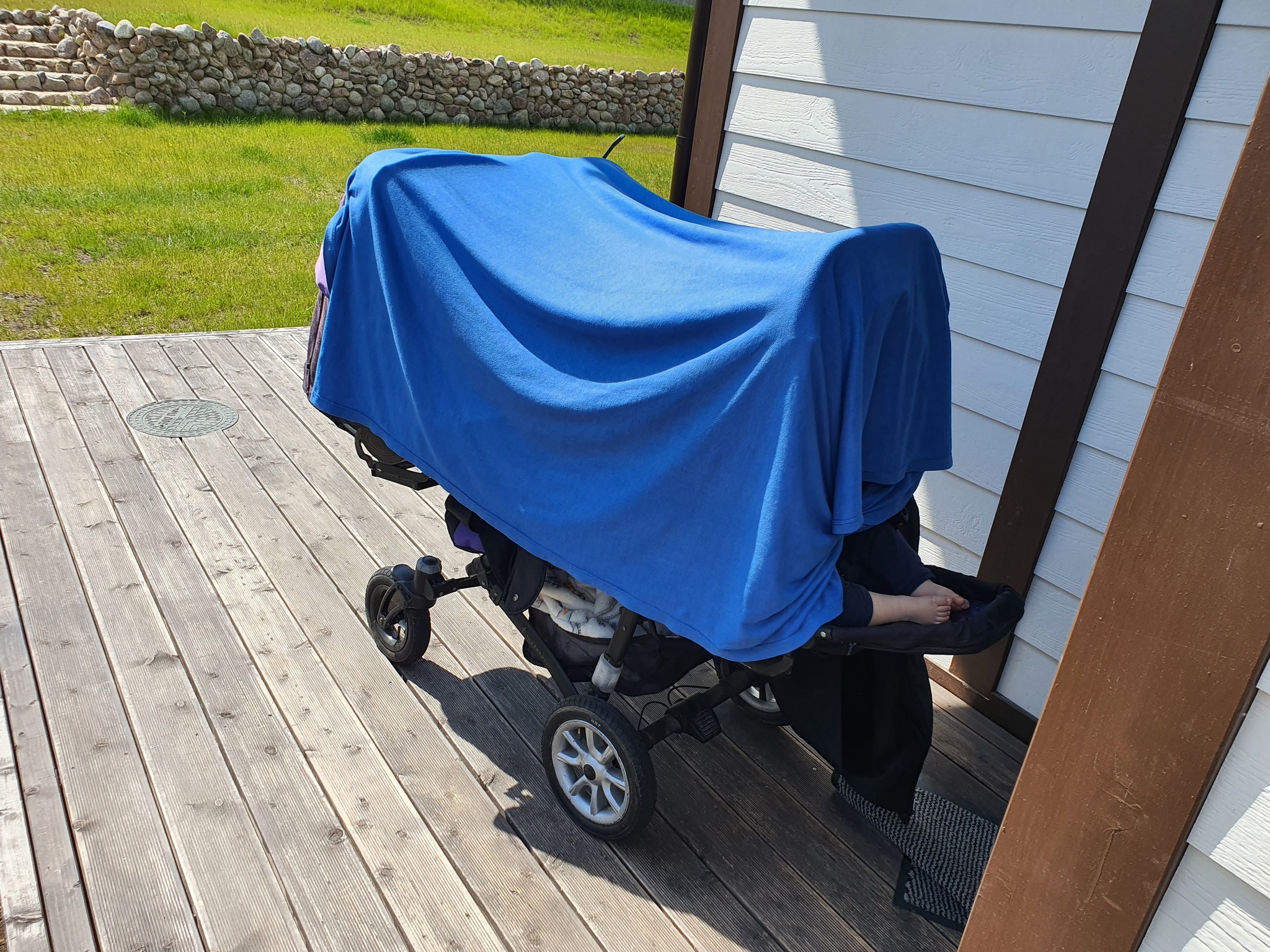 Время дневного сна. Мы спим на улице в коляске. Когда солнце яркое, накрываю покрывалом, чтобы было потемнее. Коляска специальная, для тройни. Но ей тяжело, наши мальчики довольно упитанные, уже приходилось ремонтировать.