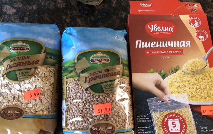 В русском магазине обычно покупаю гречку, кефир и какие нибудь шоколадные сырки ну и что попутно под руку попадётся. В шкафу нашла и сфоткала для вас что осталось с последней поездки в русский магаз. Гречка стоит $1.59 за 800 грамм (почему именно 800?🙄), овсянка $1 за 400 грамм и 5 пакетиков $1.79